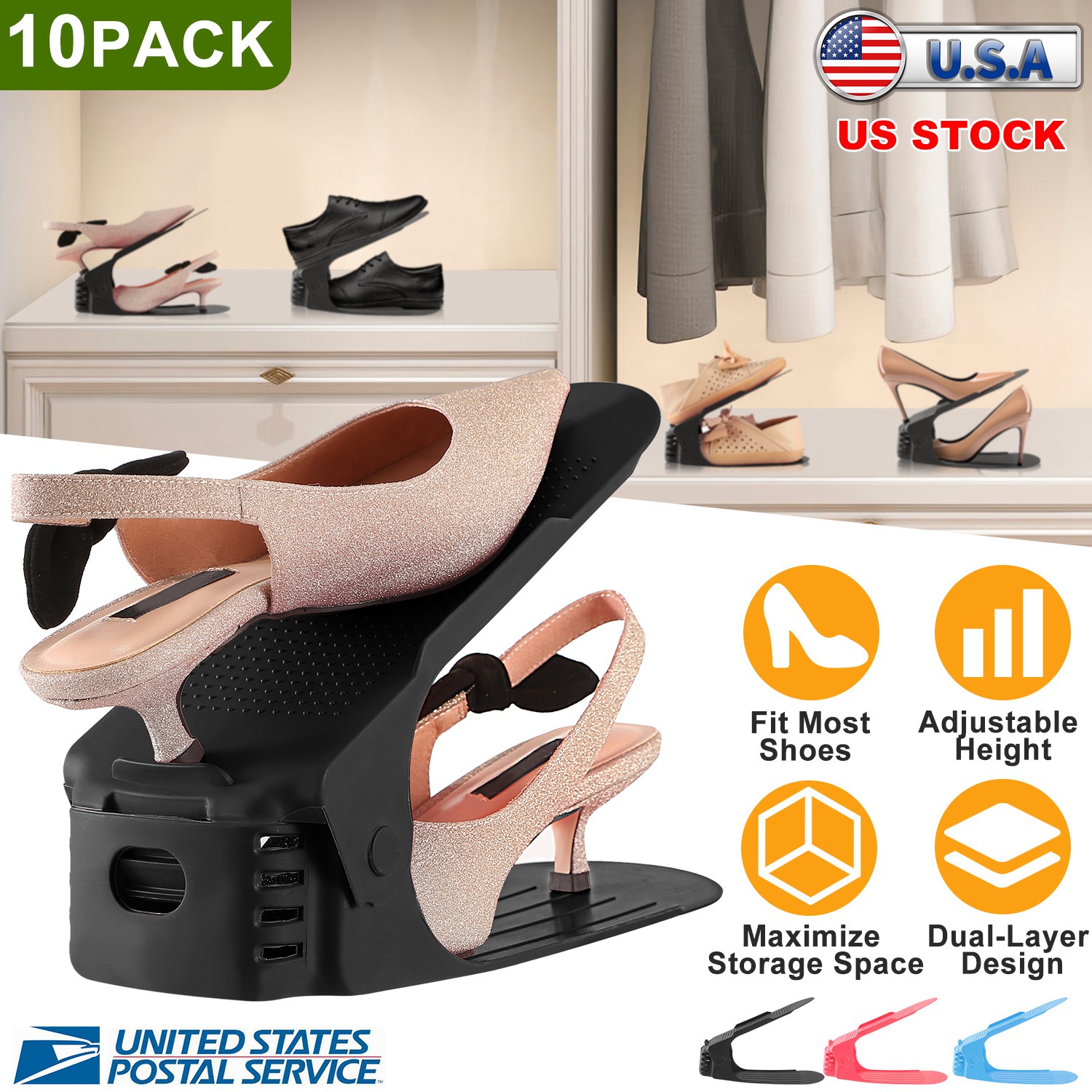Here comes a considerate design, 10 packs shoe slot organizers, to make it easier to organize kinds of shoes, also easier to take them out of closet, no more worry about shoes in mess or no enough space to store shoes. The dual-layer design holds the shoes in a vertical position, which instantly doubles your storage space & keeps your closets floors and storage areas nicely organized. Features height adjustable, it can be adjusted to accommodate every type and style of shoes including sneakers, boots, sandals, high heels, etc. Meanwhile, designed with anti-slip points on the top layer, with side & bottom buckle, which is thoughtful and great to keep the shoe from sliding off. Made of durable PP plastic, which makes 10 set of our shoe slot organizers can be used for a long time once purchased.