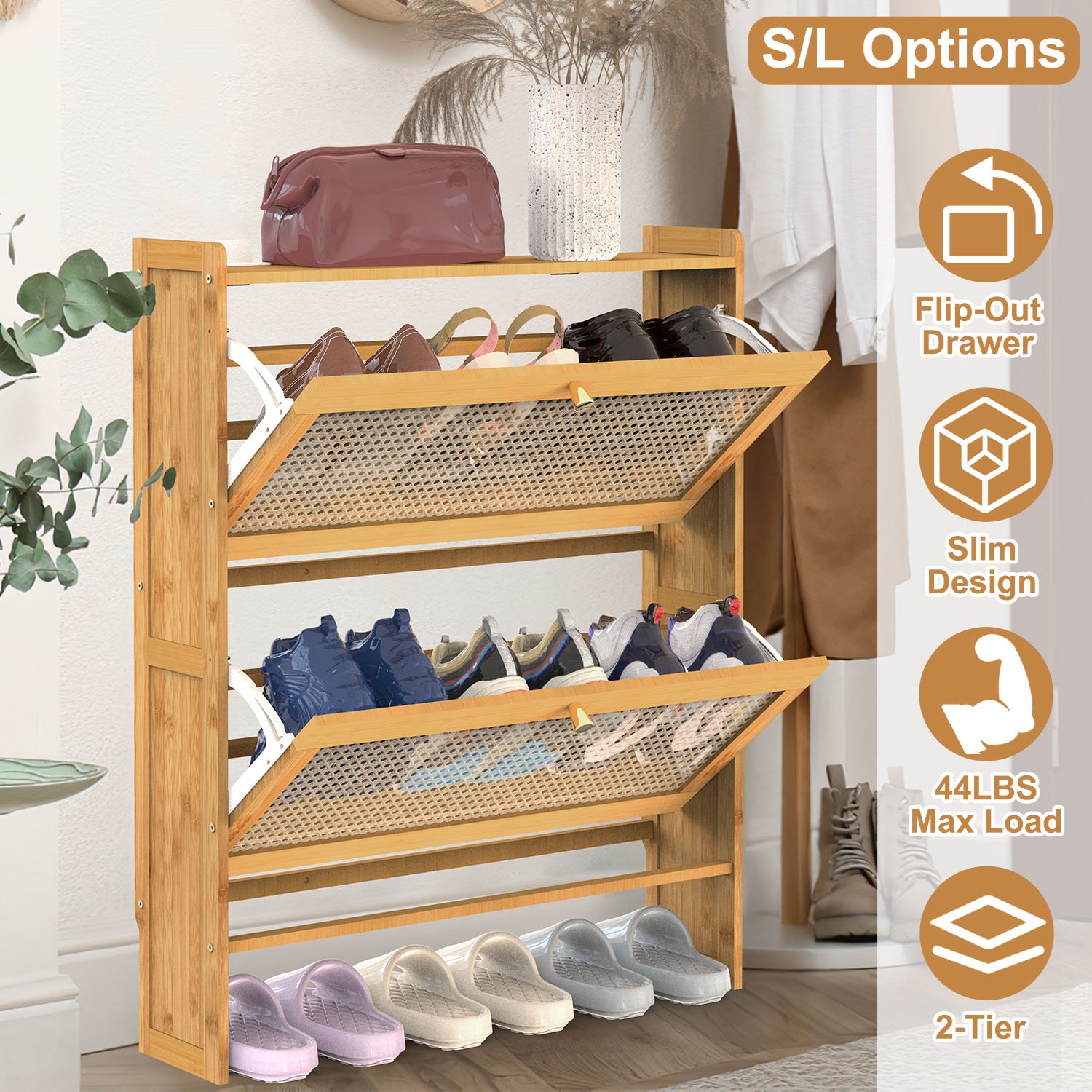2-Tier Shoe Cabinet with 2 Flip Drawers Slim Bamboo Shoe Rack Freestanding Narrow Shoe Organizer with 44lbs Max Load for Entryway Hallway
