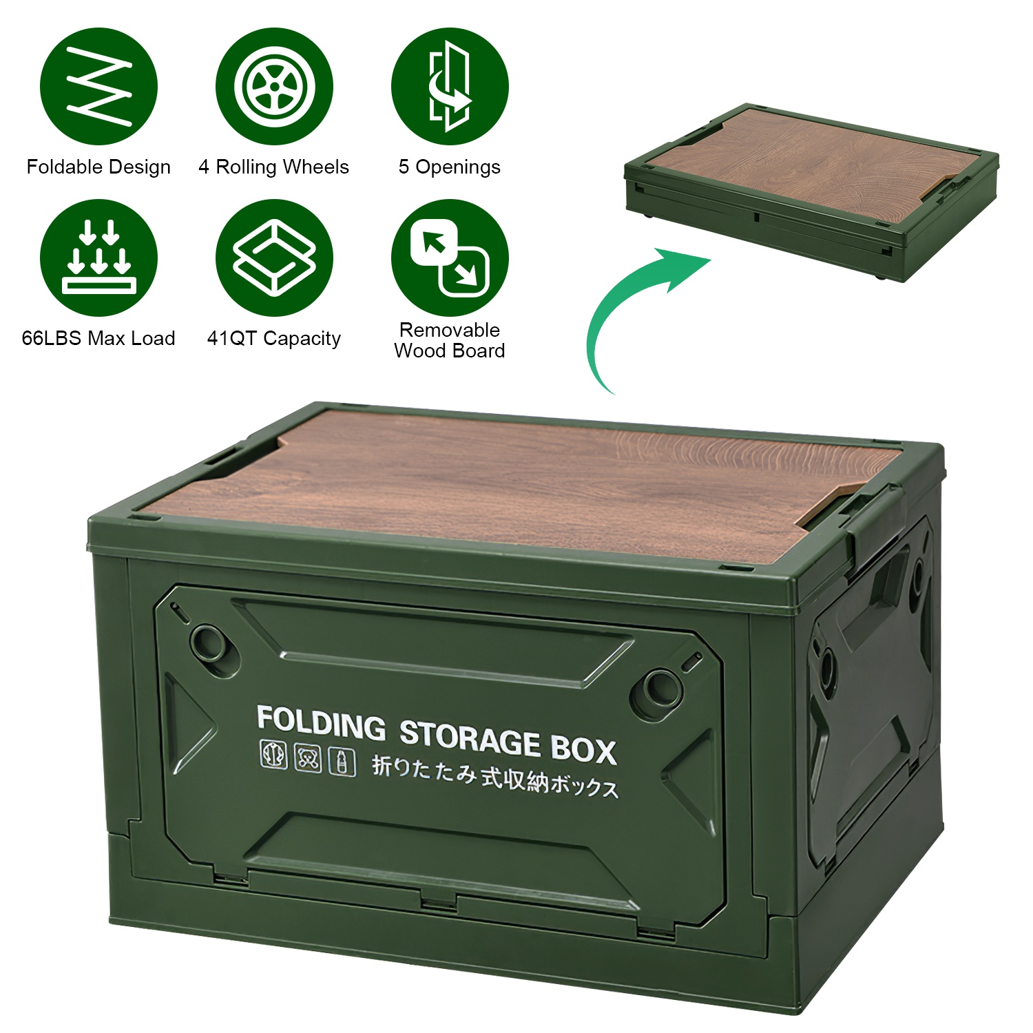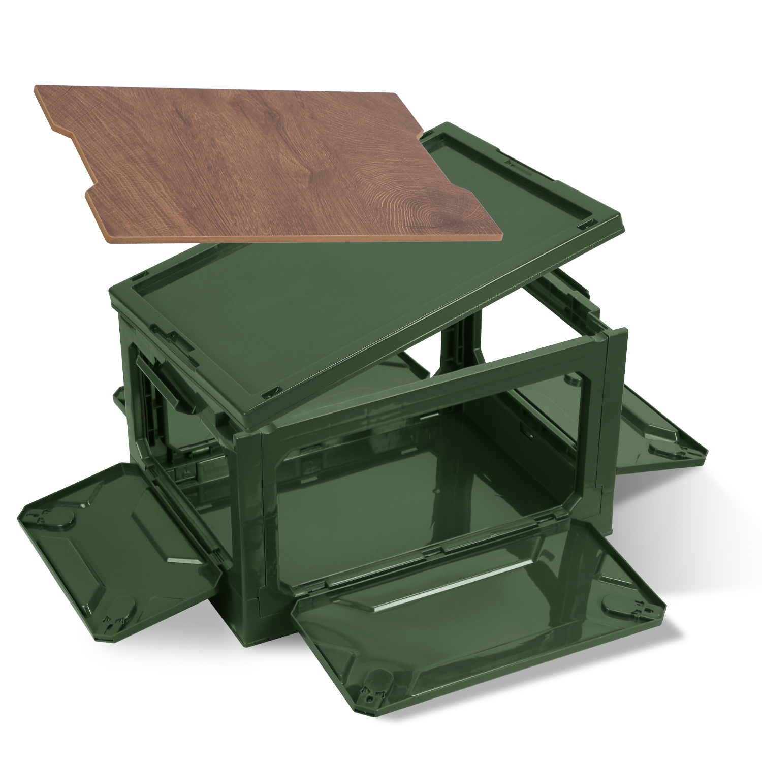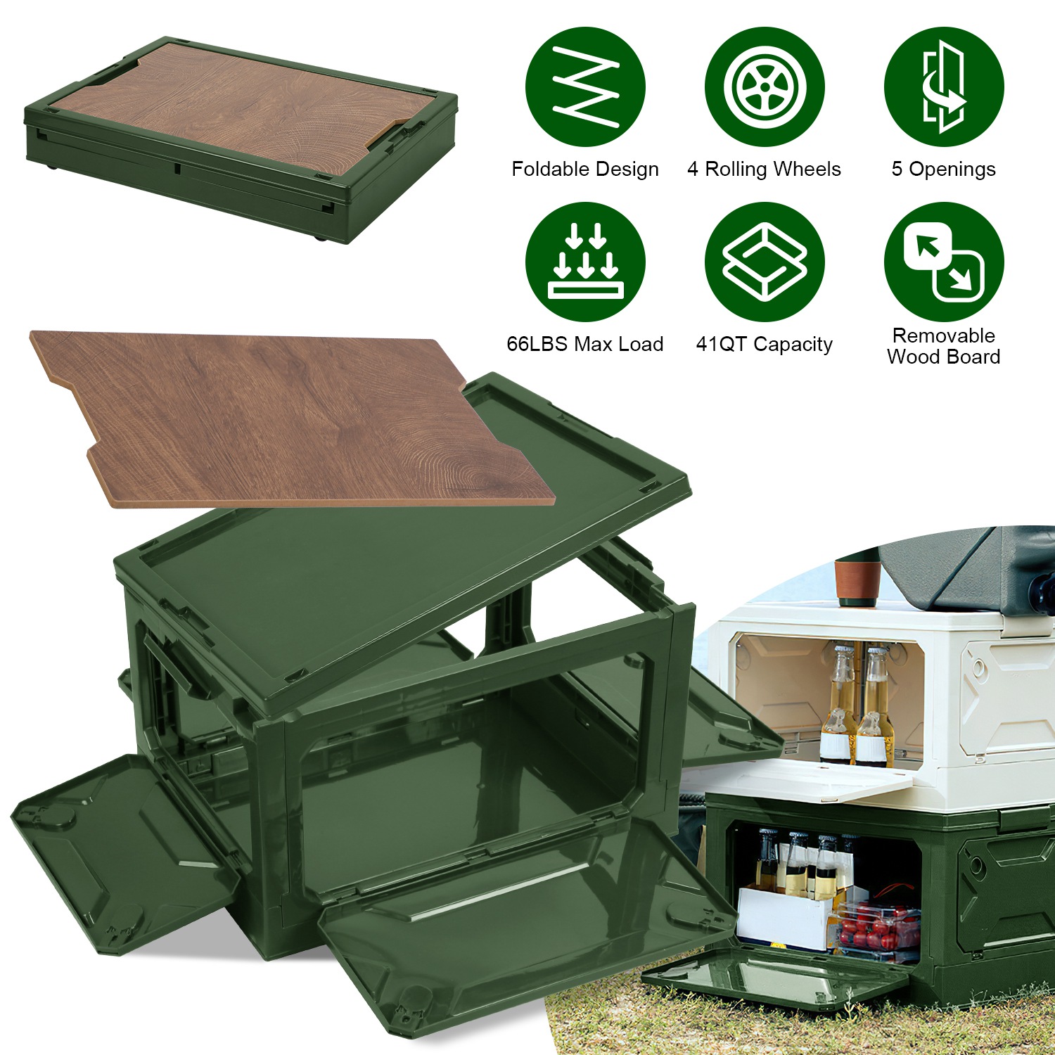 Maximize space and convenience with this ultimate collapsible storage bin! Engineered for effortless living, it folds flat in seconds when not in use, tucking neatly under a bed or into a closet. Stack multiple bins securely to conquer clutter. Access your gear instantly from any angle – four lockable side doors plus the top lid open wide, even when stacked. Bonus versatility: The MDF top board doubles as a sturdy chopping surface for outdoor adventures or a stable tabletop for holding items. Built tough yet lightweight with advanced PP plastic and MDF, it confidently holds up to 66 lbs (30kg). With a generous 39L (41QT) capacity, it's your go-to solution for everything from camping gear, sports equipment, and tools to pantry overflow, clothes, and office supplies – indoors and out. Simplify storage. Elevate organization.