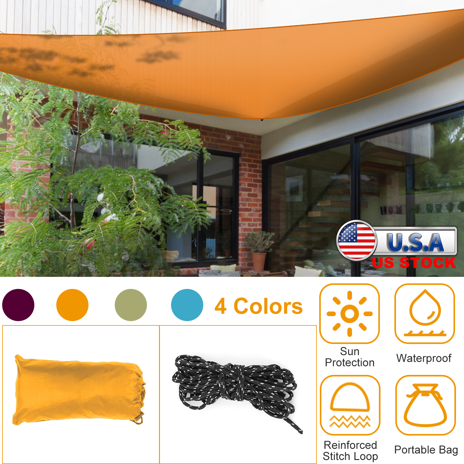 Our Shade Sail Top Canopy, made of polyester taffeta material, is waterproof and can block the sun for you, which is durable enough to last a long time. All durable edges, which are reinforced, can properly tension. Pull the rope tighter, keep knots stay tight without any slipping. You can use it in the patio, lawn, garden and so on in the sun or in light rain. But do not use it in heavy rain.