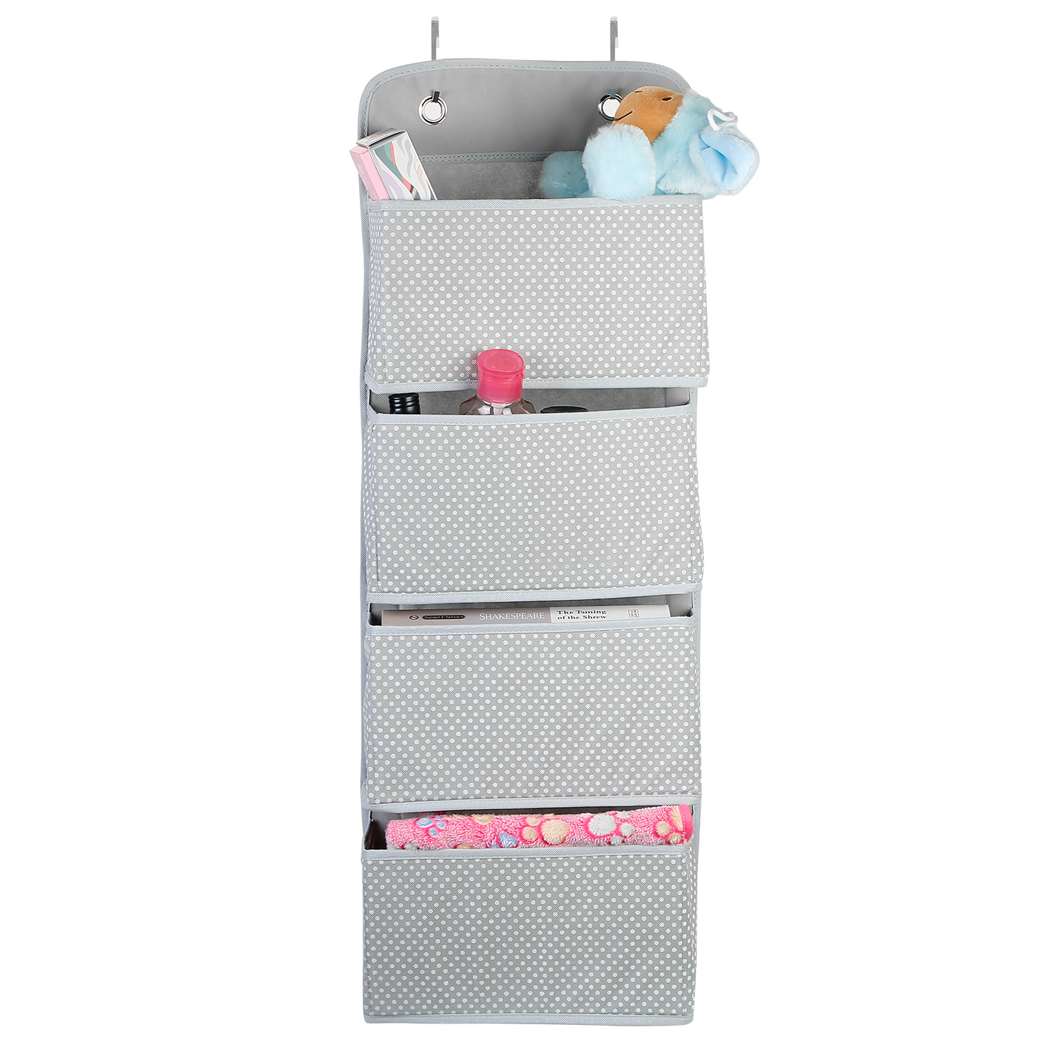 Multipurpose storage organizer can be used in the bedroom, children's room, office to categorize your clothes, baby's toys, office suppliers, etc., creating a clean and tidy place for you with no mess. It's easy to install with two included thickened metal hooks, and shaped stably with extra cardboards. Durable PVC material makes it not easy to tear off and last a long time. It can be folded to store when not in use for saving space.