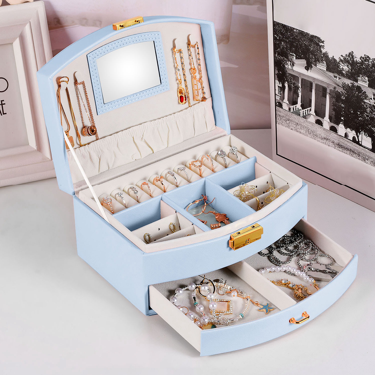 Thrill your girl with our jewelry gift box! Our jewelry box comes with 2 layers, which offer a spacious space for all your precious jewelry pieces or beautiful hair accessories, such as bracelets, watches, brooches, necklaces, hair ties. Rings and more. Crafted from PU leather, lockable, aesthetically pleasing and resistant to water and dust. The compact size and soft handle makes it easy to carry wherever you go. The mirror allows for effortless grooming or checking your appearance. An ideal gift for beautiful jewelry organizer for wives, girlfriends and teen girls on Valentine's Day, Mother's Day, Thanksgiving, Christmas, birthdays etc..