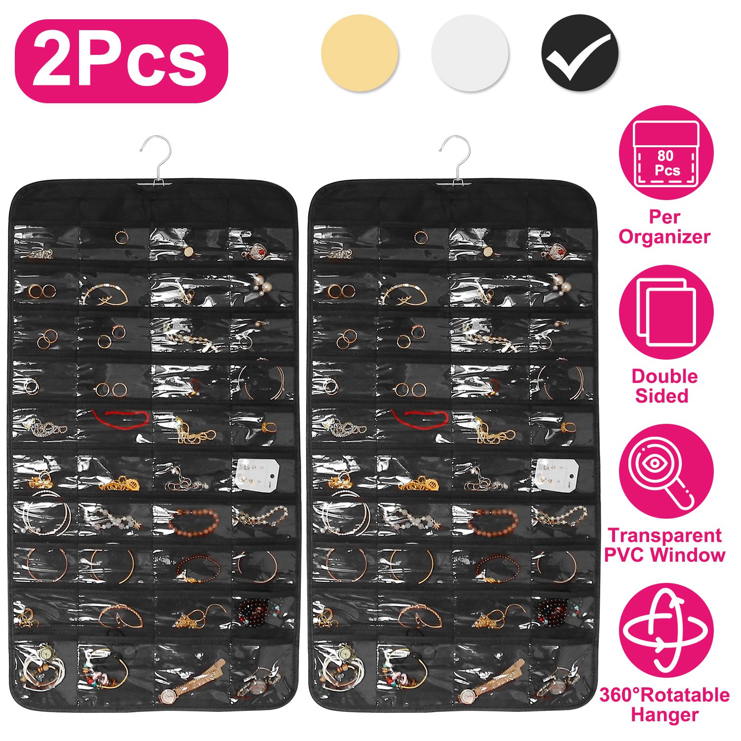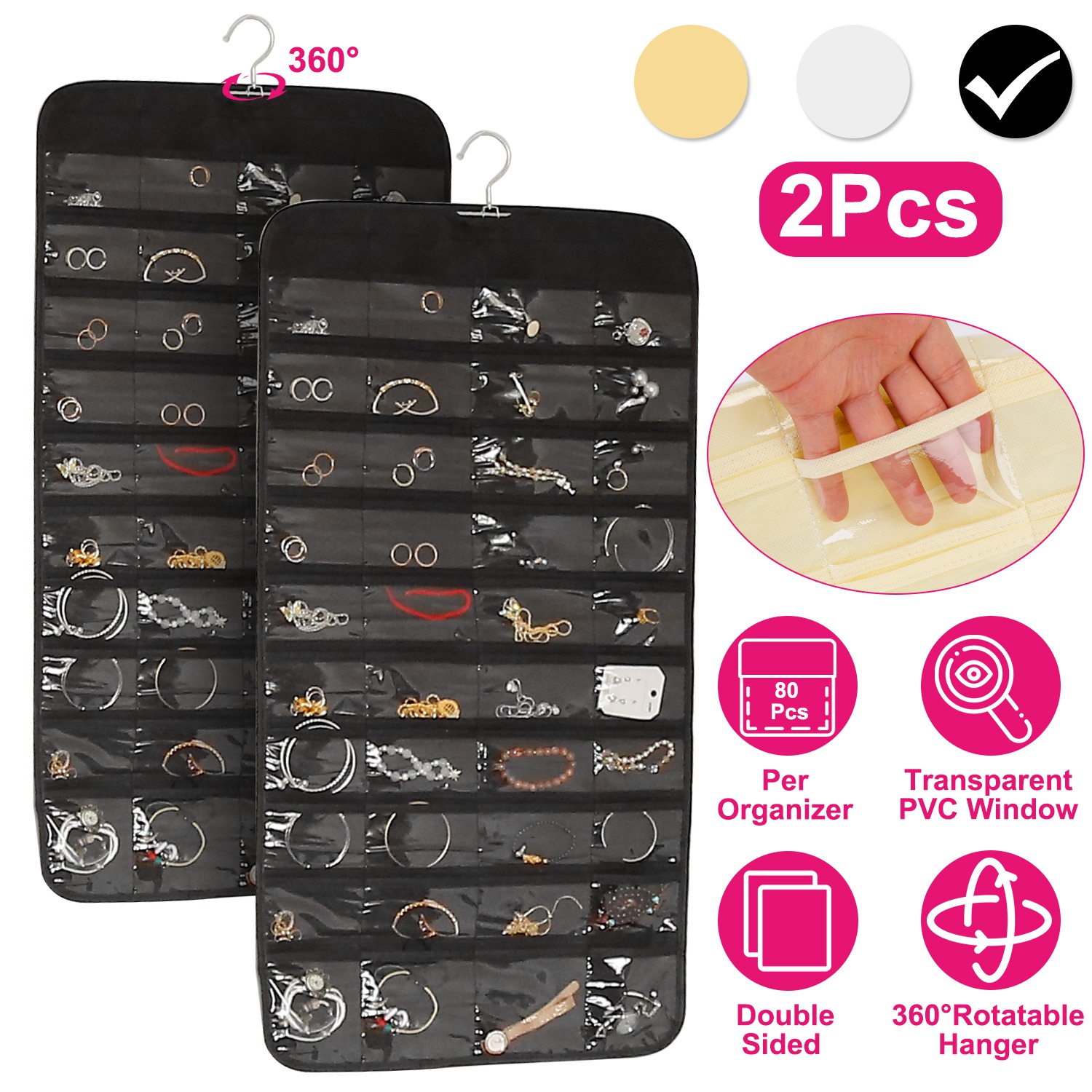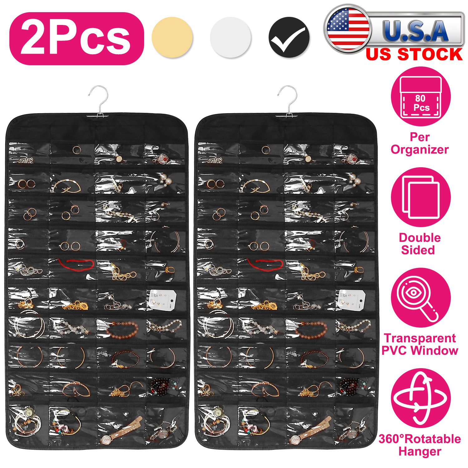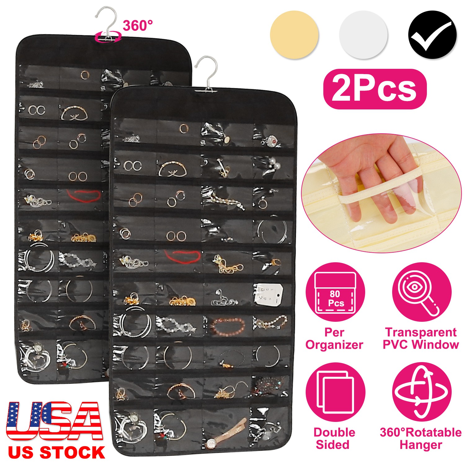 2Pcs Hanging Jewelry Organizer Earring Necklace Bracelet Holder Double-sided 80 Pockets Accessory Storage Pocket