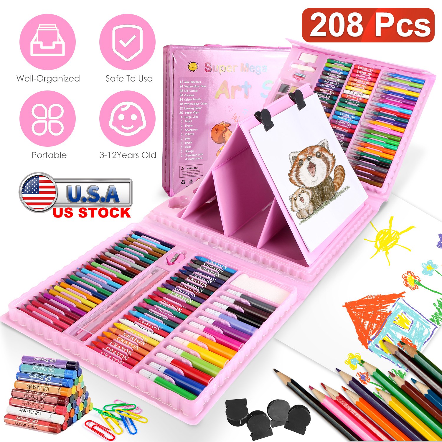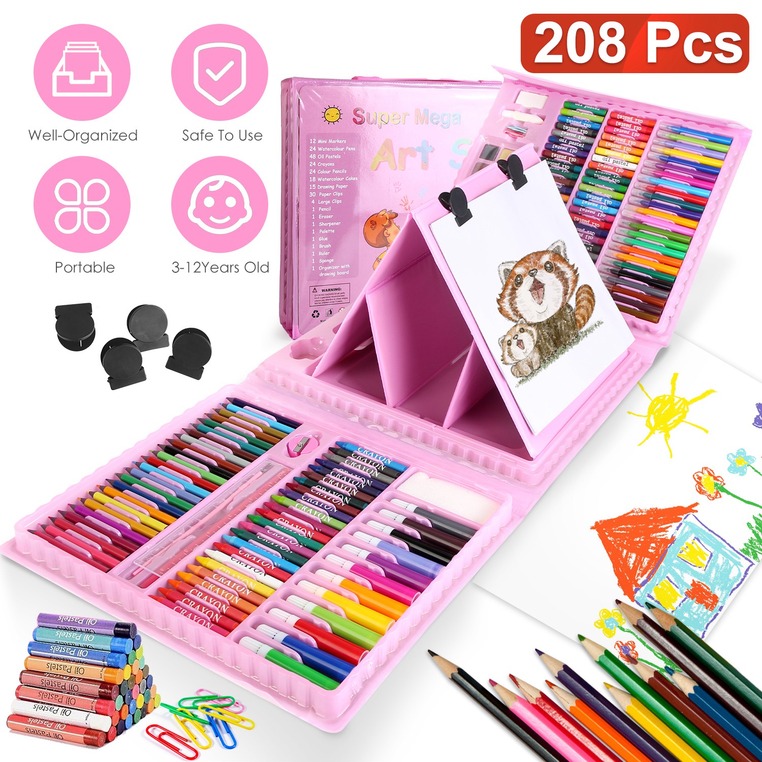 208Pcs Drawing Art Kit Art Supplies For 3-12Years Old Girls Boys Art Storage Box with Double Sided Trifold Easel Oil Pastels Crayons Colored Pencils W