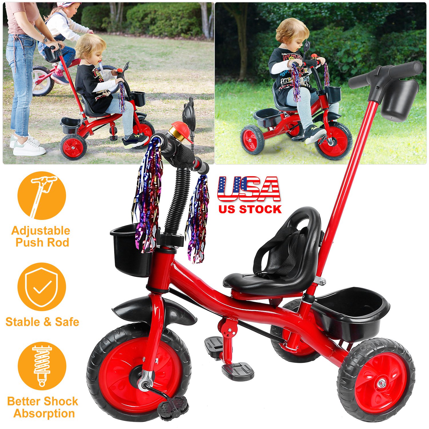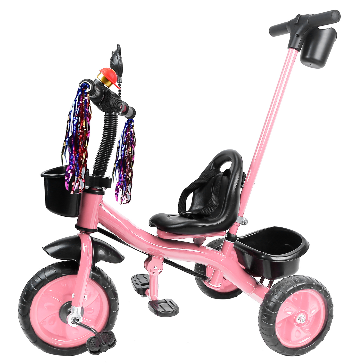 Our Kids Tricycle, with an adjustable and a removable rod, is convenient for mothers to push the baby and control the steering and speed and also allows baby to ride freely. Three-wheel design and safe belt can prevent danger. Plastics tires, enlarged seat, and anti-skid pedal can give your child more comfortable riding experience. Two storage boxes allow baby to carry more toys when going out.