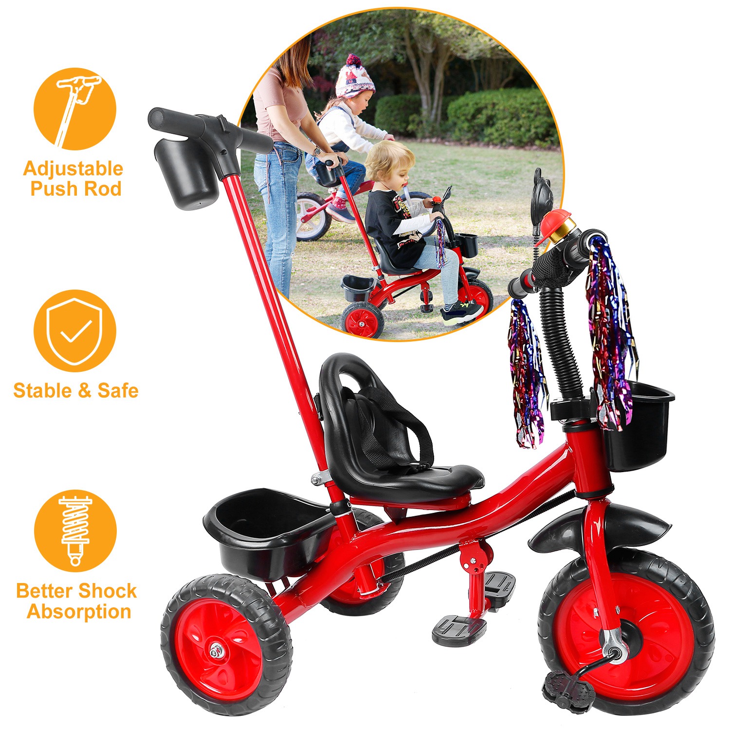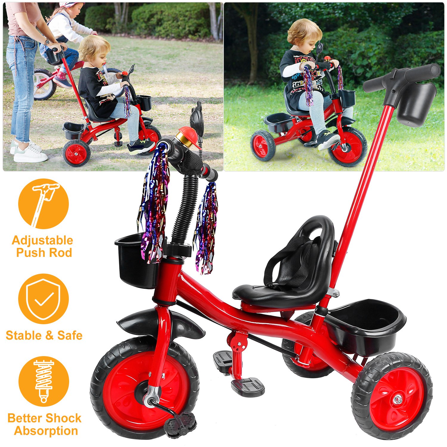 Our Kids Tricycle, with an adjustable and a removable rod, is convenient for mothers to push the baby and control the steering and speed and also allows baby to ride freely. Three-wheel design and safe belt can prevent danger. Plastics tires, enlarged seat, and anti-skid pedal can give your child more comfortable riding experience. Two storage boxes allow baby to carry more toys when going out.
