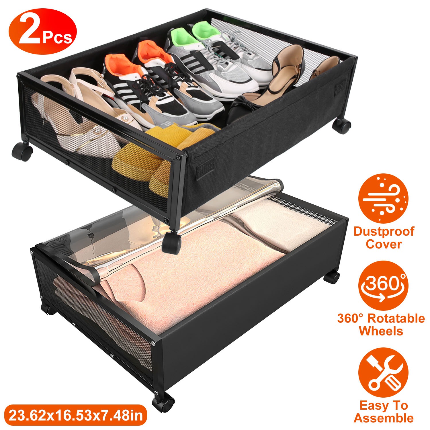 Our storage containers help you to make full use of the space of bed, sofa, closet, you can store books, shoes, seasonal beddings and clothes, keep those less-used items out of sight, make you house look tidy and well-organized. Featured with oxford cloth and mesh side, effectively prevent items from dust, mildew and moisture. Transparent cover and 360° rotatable wheels are convenient for you to quickly access what you need. Ideal assistant for people who feel like the storage space is always insufficient.