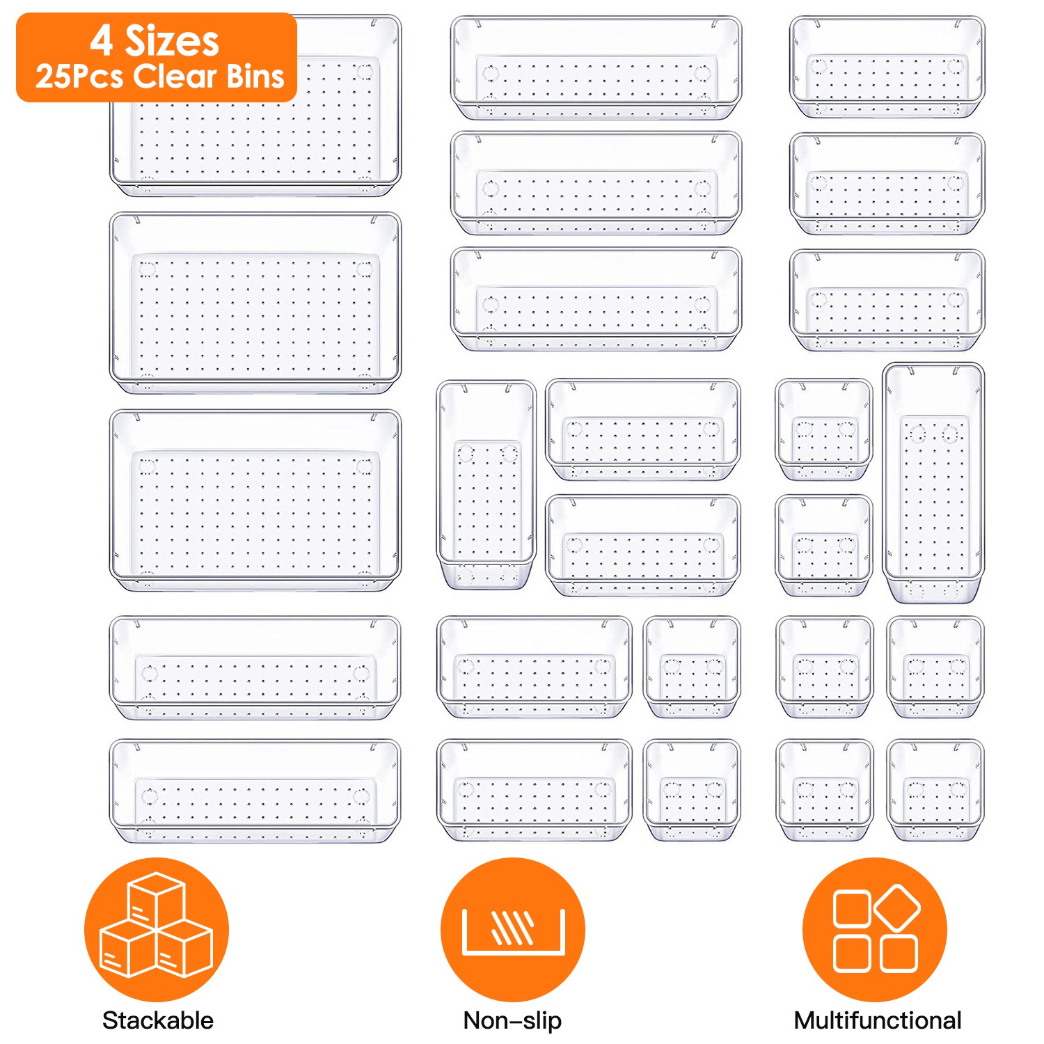 Home > 25Pcs Clear Plastic Drawer Organizers Set 4 Sizes Desk Drawer Dividers Trays Storage Bins for Vanity Cabinet Makeup Bathroom Office Kitchen Bedroom Je