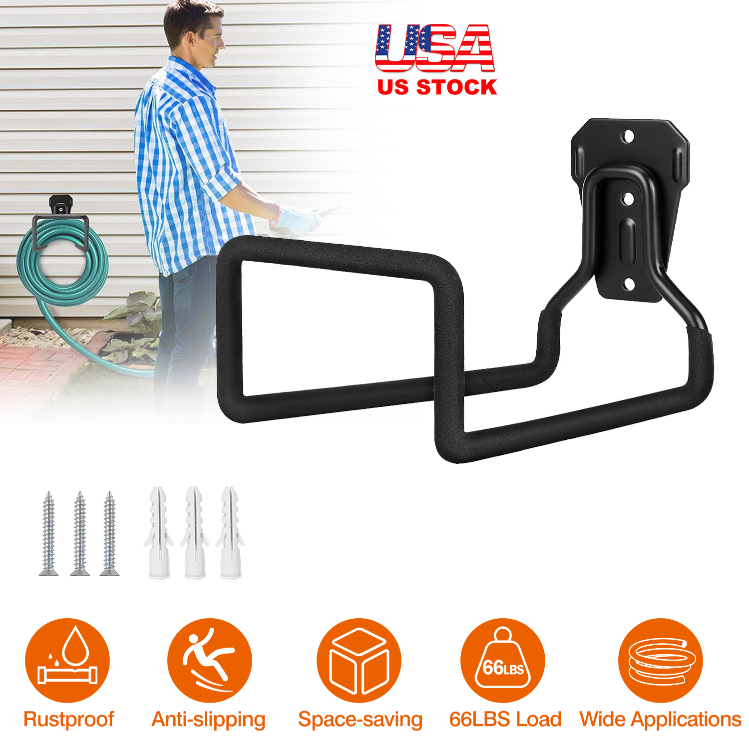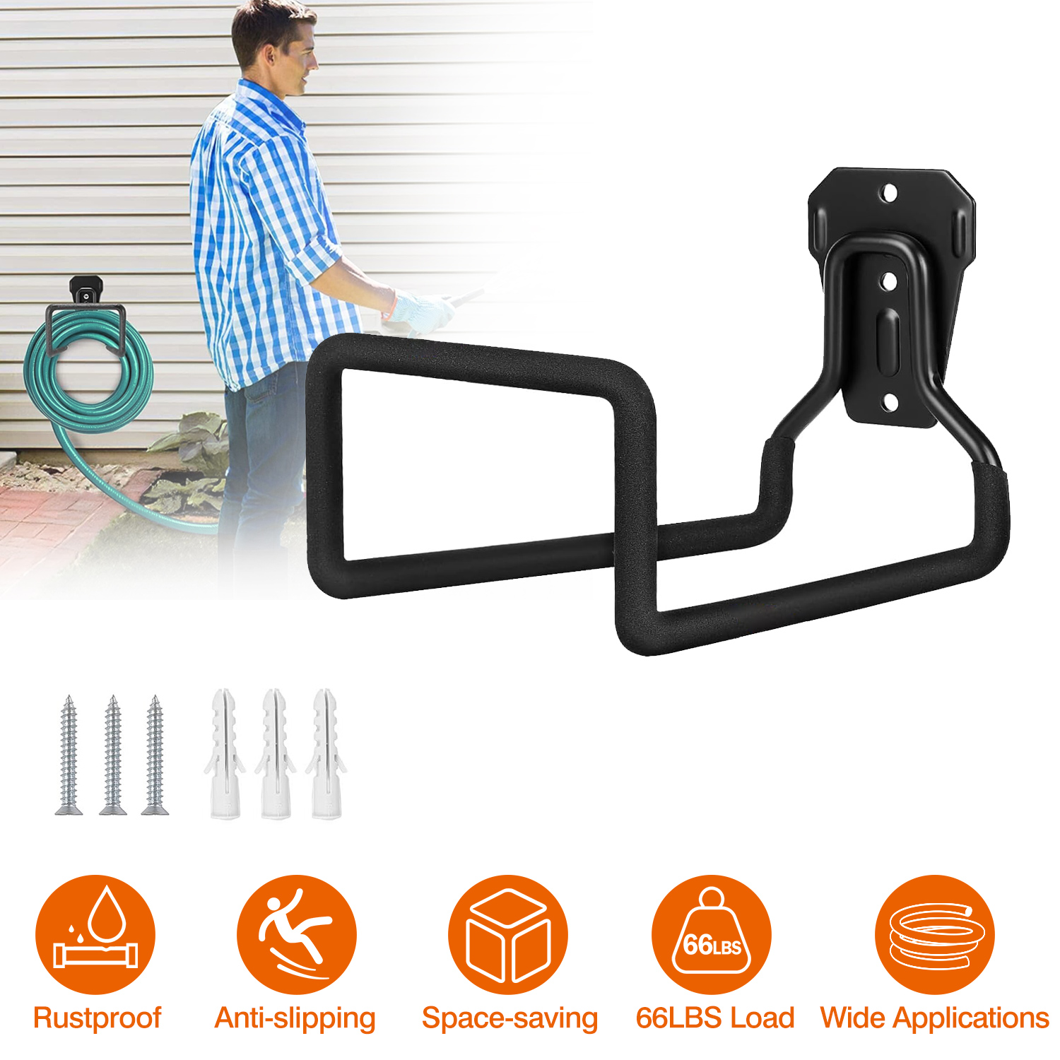 Made of heavy-duty iron and anti-slip rubber coating, our hose hanger helps you organize the water hoses, which saves your garden space and keep hoses tidy and clean. Rustproof and sturdy enough to hold up 66lbs load, which can withstand rainy weathers. Perfect for holding water hoses, extension cords, air compressor hose, pool hose hanger, strollers, bikes, etc. Ideal for garden, garage and workshop organization. Easy to install and use.