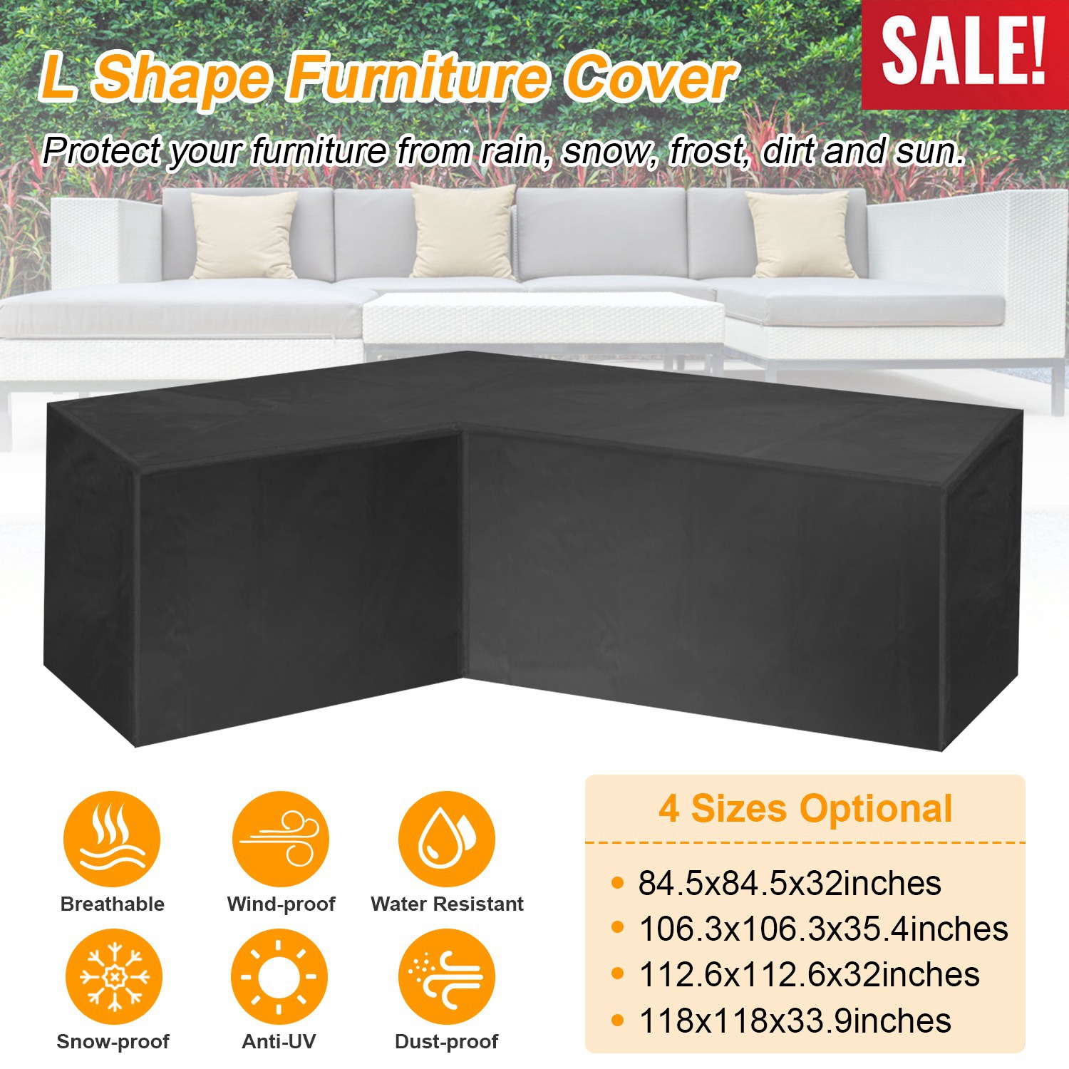 Our furniture cover featured with L shapes, adopt premium polyester materials with PVC coating, water resistant and anti-UV, protect our outdoor furniture from dust, rain or other bad weather condition, a way to save money for keeping furniture in good shape and color. Fine stitching workmanship and adjustable hem cord is easily and tightly to cover your furniture. Easy to fold and store in our included bag. Fits for L-shaped furniture or sofa set.