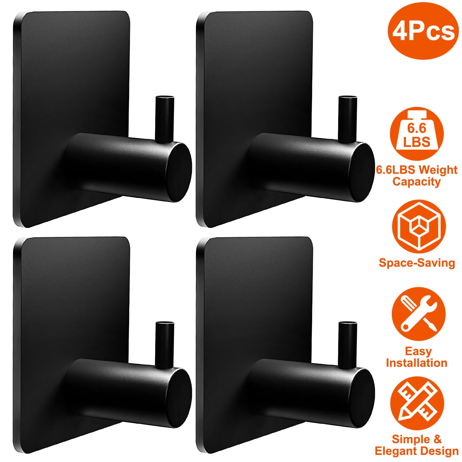 4Pcs Self Adhesive Hooks Stainless Steel Sticky Wall Hanging Hooks Black Hanger Hook Holders for Robe Coat Hat Keys Utensils in Bathroom Office Home