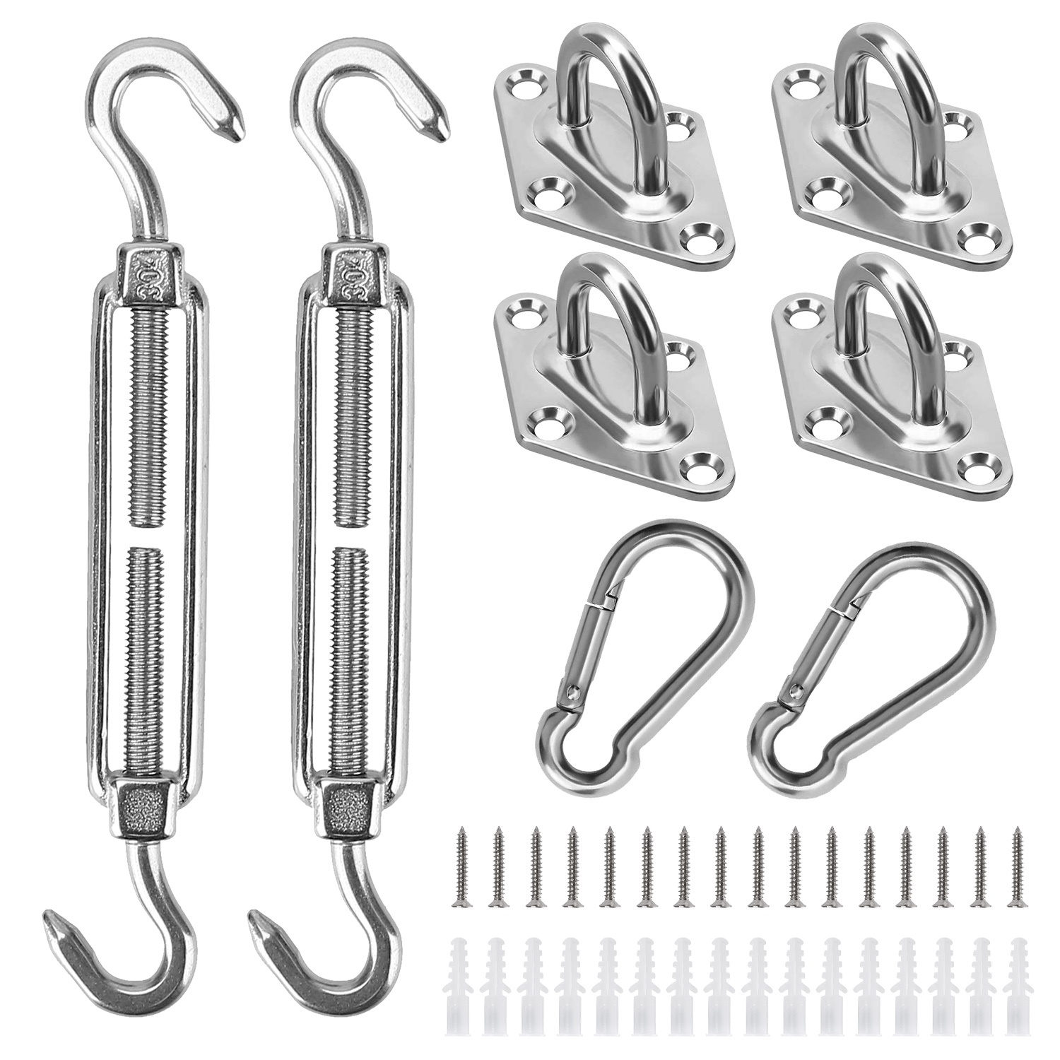 Come with total 32pcs in this hardware set with Rhombus Pad Eyes, M5 Turnbuckles, Snap Hooks, M4 Screws and Plastic Expansions, the kit is perfect to install or reinforce any rectangle or square shade sails to any structure, tree or pole in the garden or when camping or hiking outside. Made of premium stainless steel and adopting sturdy construction, can attach the sail firmly and stably. Turnbuckles can no doubt create tension, meeting your needs perfectly. A great assistant for you!