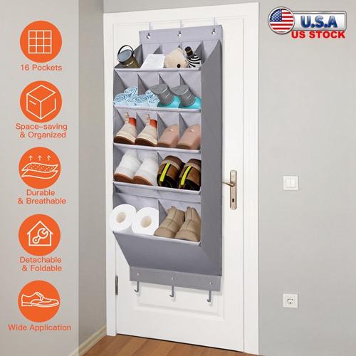 Do you always feel like there is no enough storage space in your home? Try our 5-tier over the door shoe organizer, instantly double maximize storage to any space with 16 large pockets. Fit for all standard doors and closets. Helps you to organize women and kid shoes, boots, bags, towels, toys, skincare products, cleaning tools in bathroom, pantry, kitchen etc.. Made of durable 600D Oxford fabric and palstic tubes, breathable and not easy to tear. Comes with 3 hooks for installation, each sturdy enough to hold up to 40lbs.