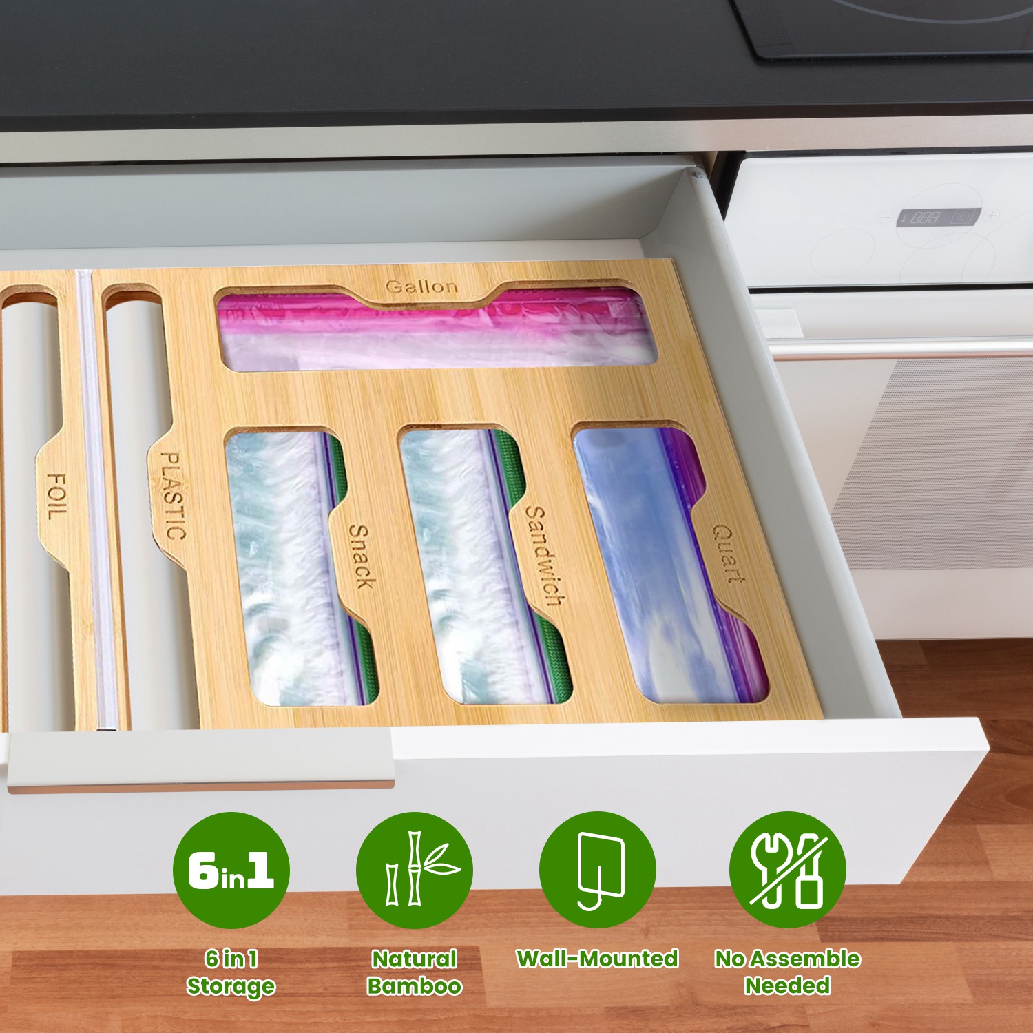 6 in 1 Plastic Wrap and Foil Organizer for Gallon Quart Sandwich Snack Ziplock Bag Bamboo Dispenser with Cutter Kitchen Drawer Storage