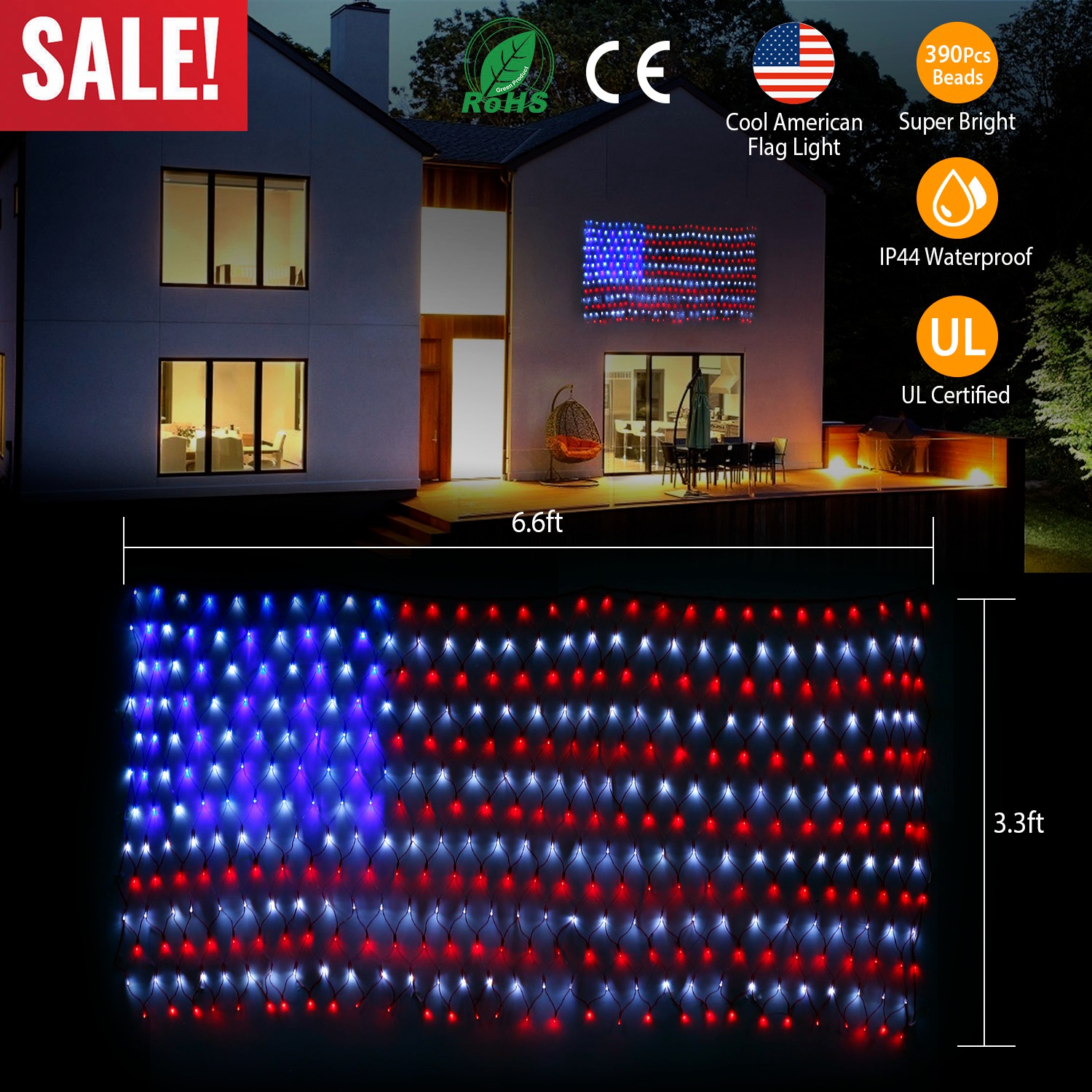 Come with 390Pcs super bright LED beads and 6.6x3.3ft perfect size, our flag light is a beautiful decoration indoor and outdoor with IP44 waterproof rating, perfect for many celebration occasions to express your patriotism. Certified by UL, just plug and play for safe using. 16.4FT cable allows you to hang it anywhere you want and the clear plastic frame construction allows lights to be seen from both sides.