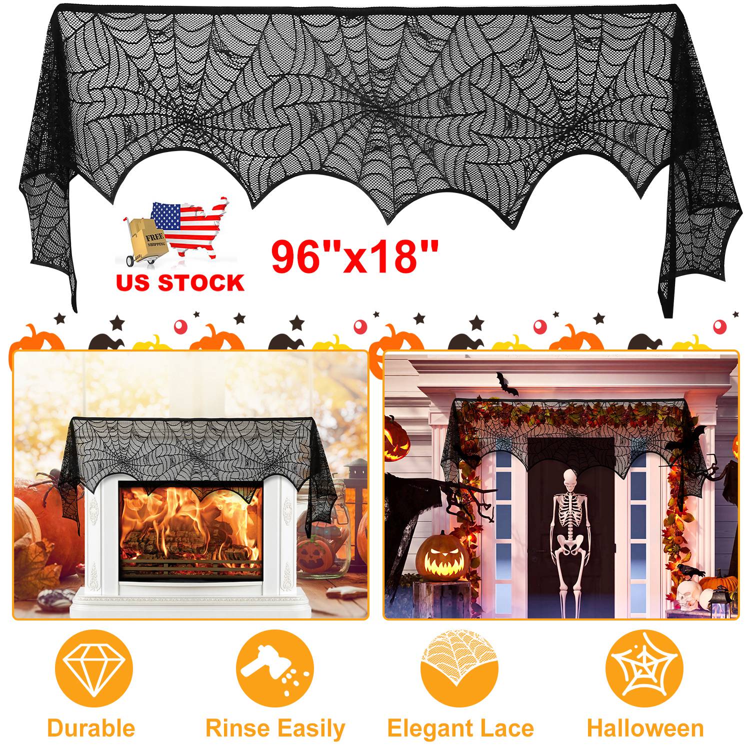 Home > Halloween Decoration Black Lace Spiderweb Fireplace Mantle Scarf Cover Festive Party Supplies Fireplace Scarf 96 x 18 inch for Halloween Christmas Par