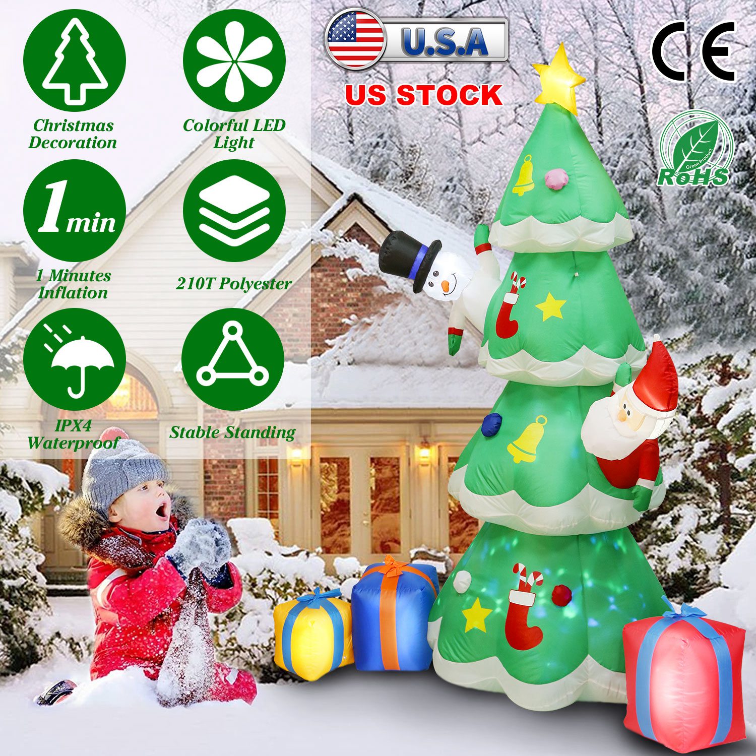 Our 6.89FT height Christmas standing decoration is designed with one large Christmas tree with gift boxes, snowman and cute Santa Claus, classic Christmas elements are perfect choice to adorn your yard, garden, lawn, porch, party and so on. Adopt built-in air blower, you can instantly finish inflation in 2 minutes, zipper on the bottom makes deflation even quicker. LED lights and colorful revolving light will attract your neighbor’s attention at night, create joyful festival atmosphere.
