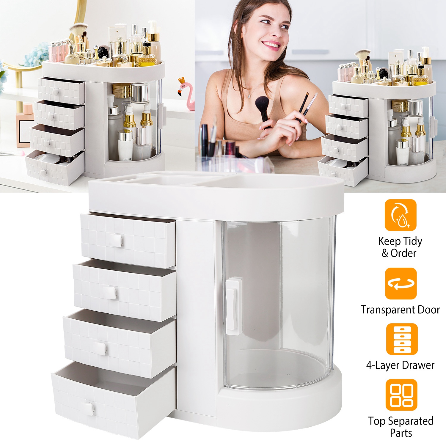 Are you tired of finding your makeups everywhere and feel so messy on your dresser? Designed with a big transparent part, 4 drawers and top separate parts, our jewelry Organizer is perfect to hold your lipstick, foundation, makeup brush, etc.. Good helper to get rid of clutter and keep your table clean and tidy, saving more space. Great for dresser and countertops of bedroom, bathroom, living room and so on.