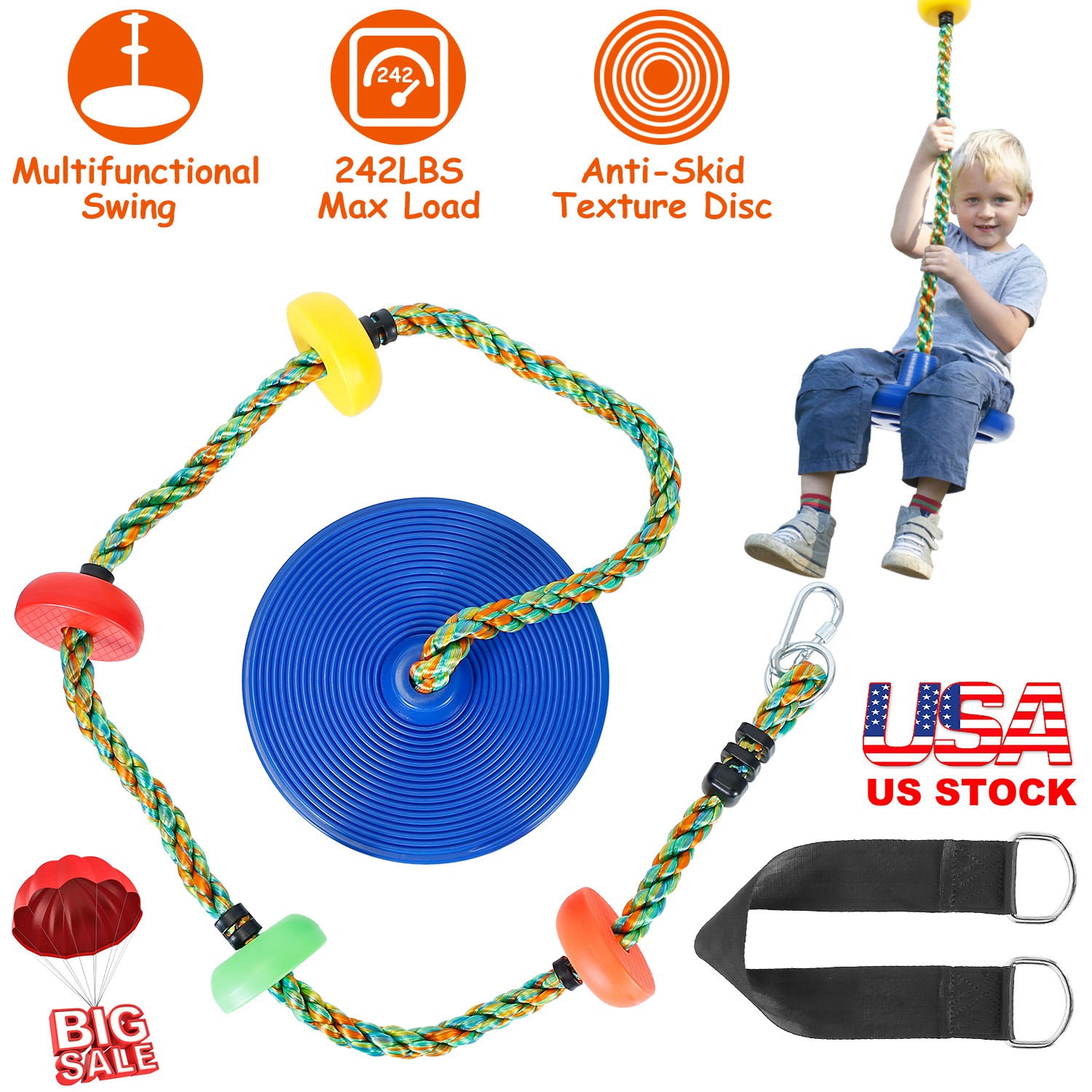 Do you want to create a playground for your kids at home and improve their body strength and imagination at the same time? Our colorful and multifunctional swing is an ideal solution! Strong and durable, the swing can hold up to 242lbs, suitable to install on tree, in backyard and other places to create a playground for your boys and girls! Can use it as a tree climbing rope, climbing ladder or a rope swing, a perfect gift for your children!