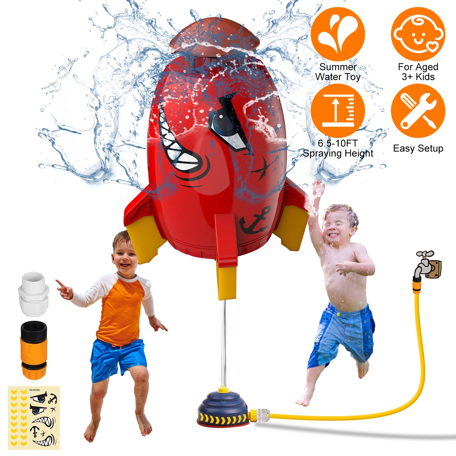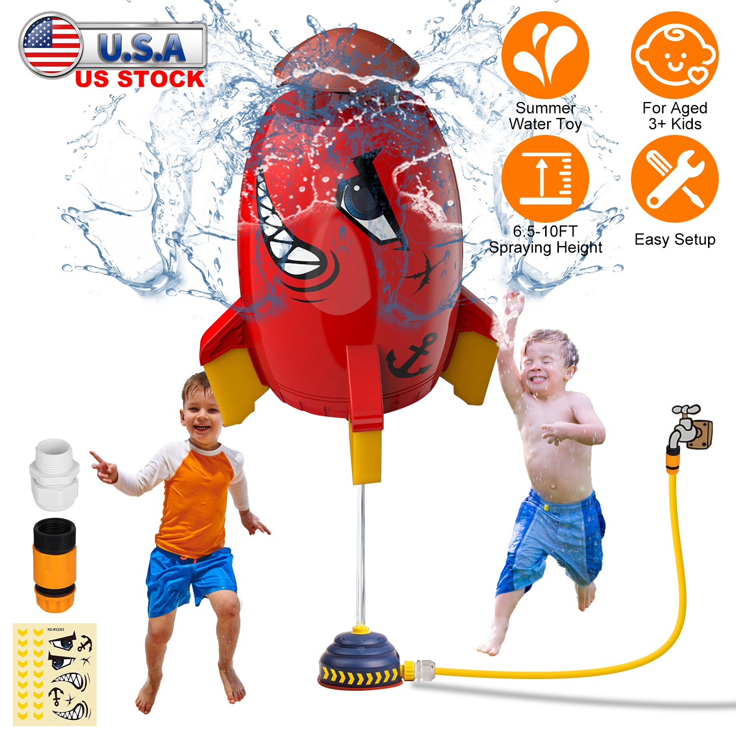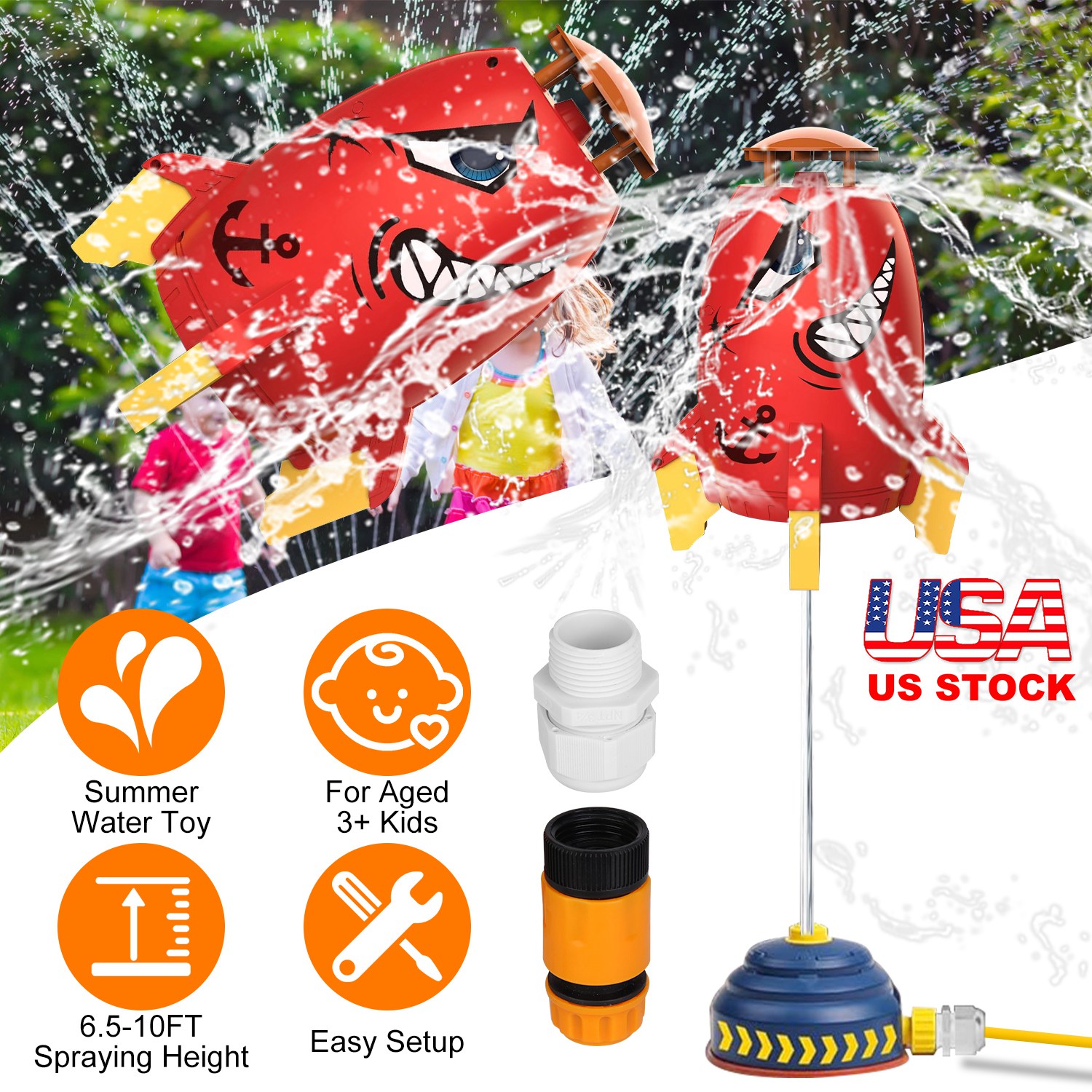 Do you want to bring your kids a cool and funny summer? Our unique rocket water sprinkler toy is a perfect choice to create a cool summer for your whole family! Simply connect the rocket launcher toy to the 1/2" water pipe and connect the pipe to the G3/4" faucet, then the rocket can fly in the air to spray water. Not only does it keep children away from electronic devices, but it also promotes interaction between children and parents, great to enjoy the cool summer funny time together. Great to make a splash at any backyard lawn, swimming pool party, beach or backyard. Ideal gift for kids ages 3+ to enjoy happy summer time!