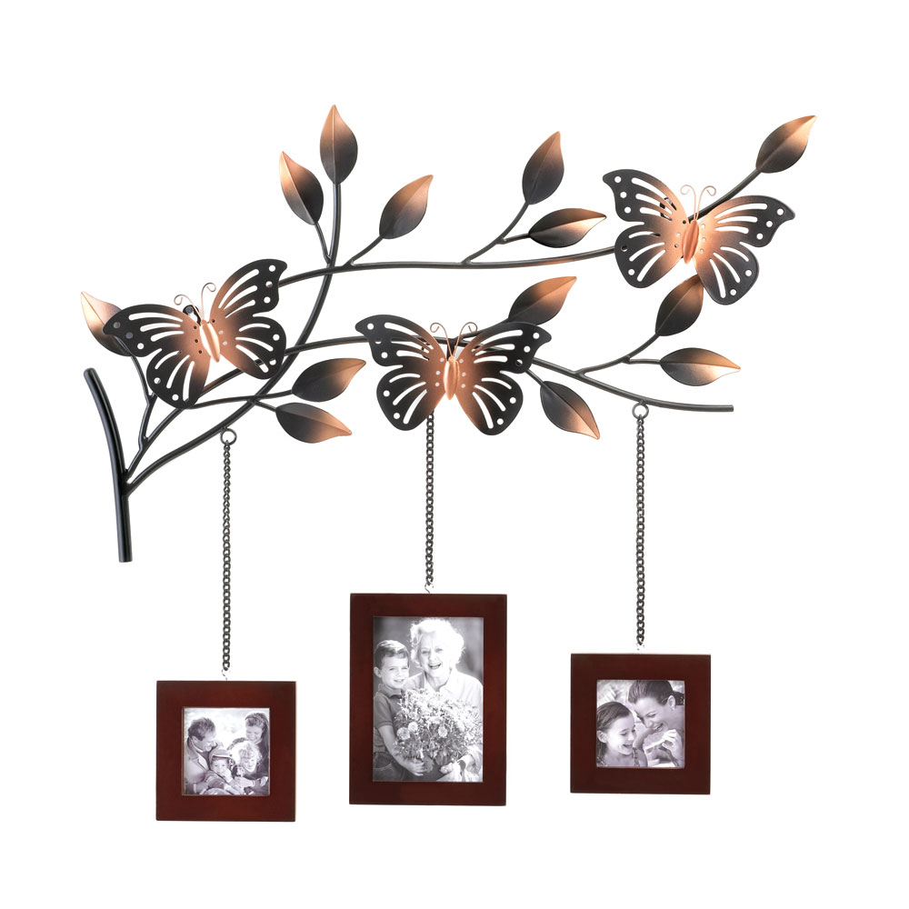 • The most lovely way to display three of your favorite family photos! A trio of wood picture frames hang from a metallic branch blooming with leaves and home to three gorgeously detailed butterflies. This fabulous wall décor will turn your favorite photo memories into an absolutely stunning focal point. Fits two 2.5 inch by 2.5 inch and one 3.5 inch by 5 inch photos.