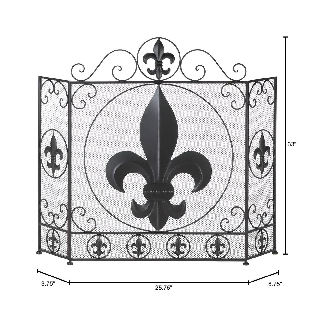 • This stylish fireplace screen makes a big statement in your chic decor. The center panel of this tri-fold screen features a large fleur-de-lis symbol surrounded by metal flourishes and smaller versions. The side panels mimic the central design and are adjustable to fit into your space.