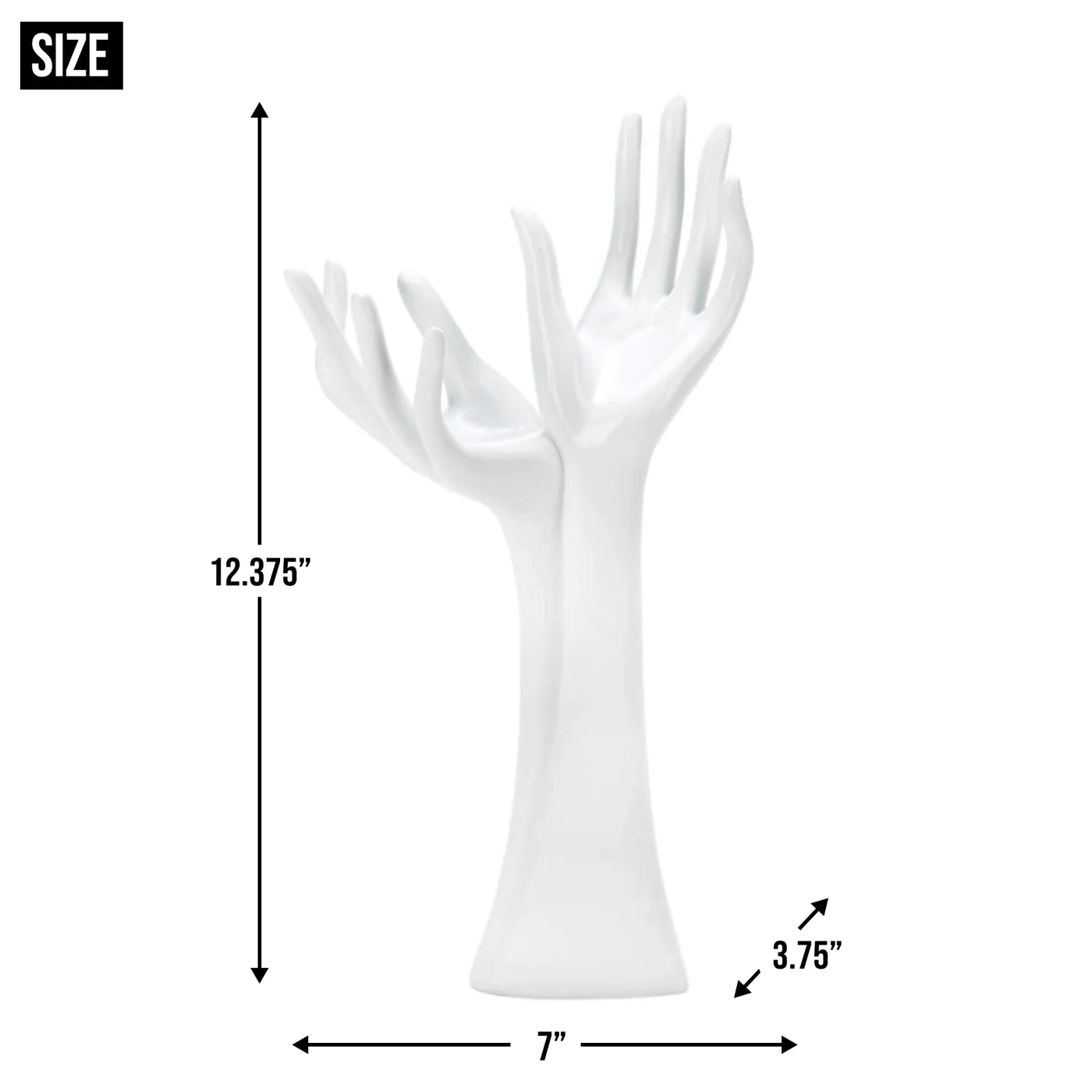 If you could use a hand (or two) to keep your jewelry organized, this beautiful statuette can help! Two sleek and slender hands reach up to keep your necklaces, bracelets and rings in order. Even when empty, it looks like a modern work of art. Item weight: 1 lb. 7" x 3 3/4" x 12 3/8" high. Polyresin. Contents not included. UPC: 849179019747.