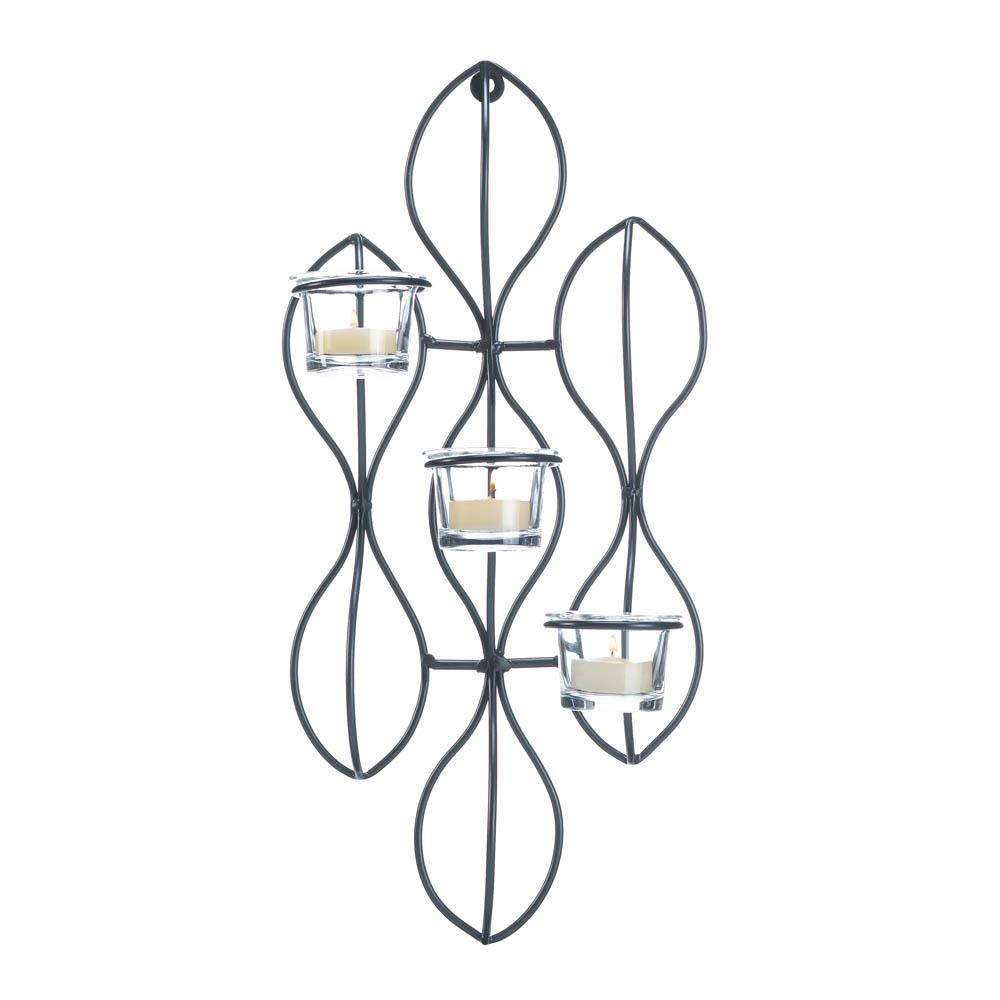 • The framework of this wall sconce features whimsical metal design and tiered glass candle cups for a modern statement lighting accent.