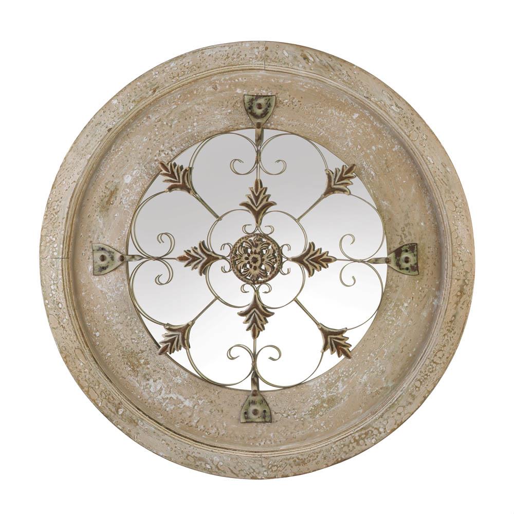 • This one-of-a-kind round wall mirror exudes a country farmhouse feel. Features whitewash wood finish with an overlay of detailed metal embellishments to showcase the mirror beneath. A great housewarming gift or personal home décor piece!