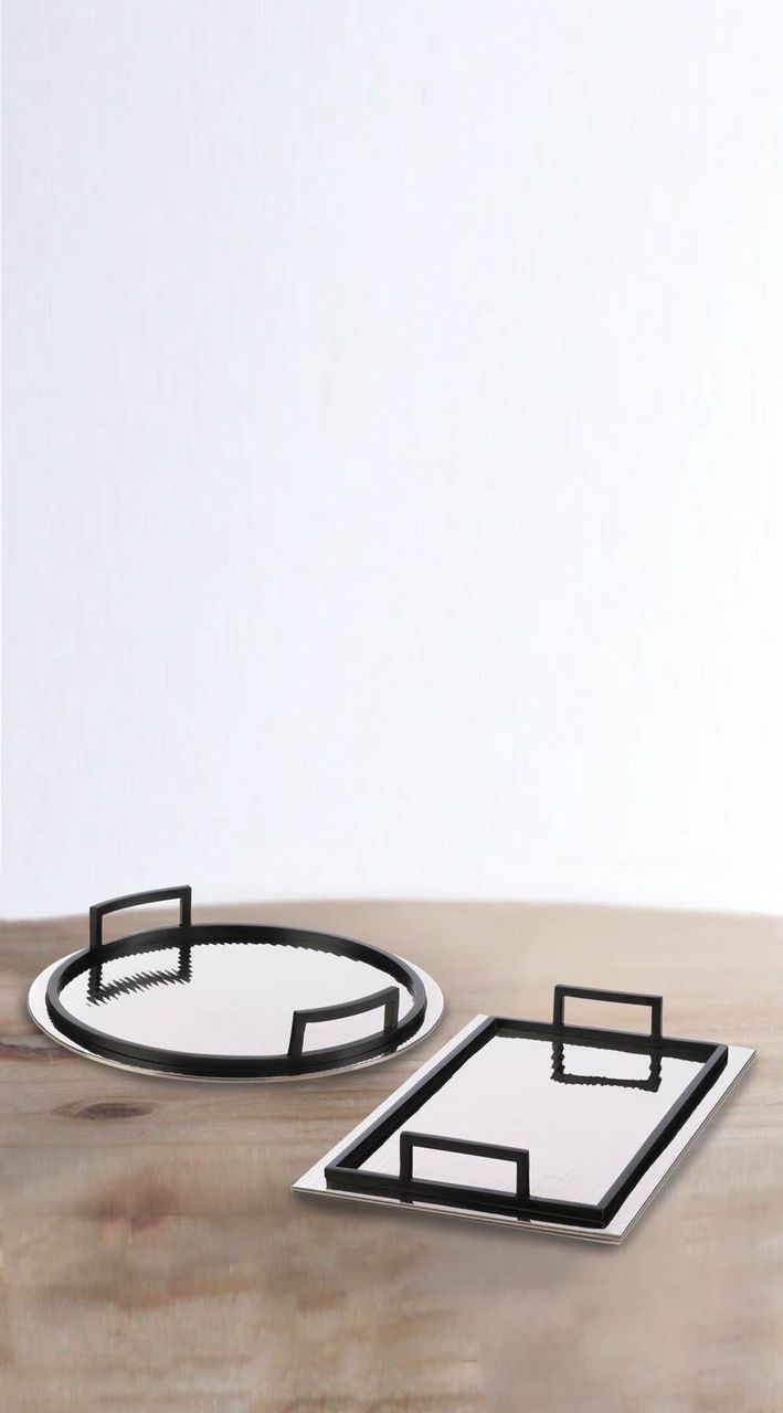 Glam-up your space with this stylish rectangular serving tray. Perfect for displaying on an entryway table, vanity, ottoman or for serving your guests. Elegant and sturdy enough to carry your cocktails from room to room! Constructed of mirrored aluminum, with rippled effect bottom and black accents. Weight 2.6 pounds. 16.5" x 10.5" x 2". Aluminum. UPC Number: 849179038298.