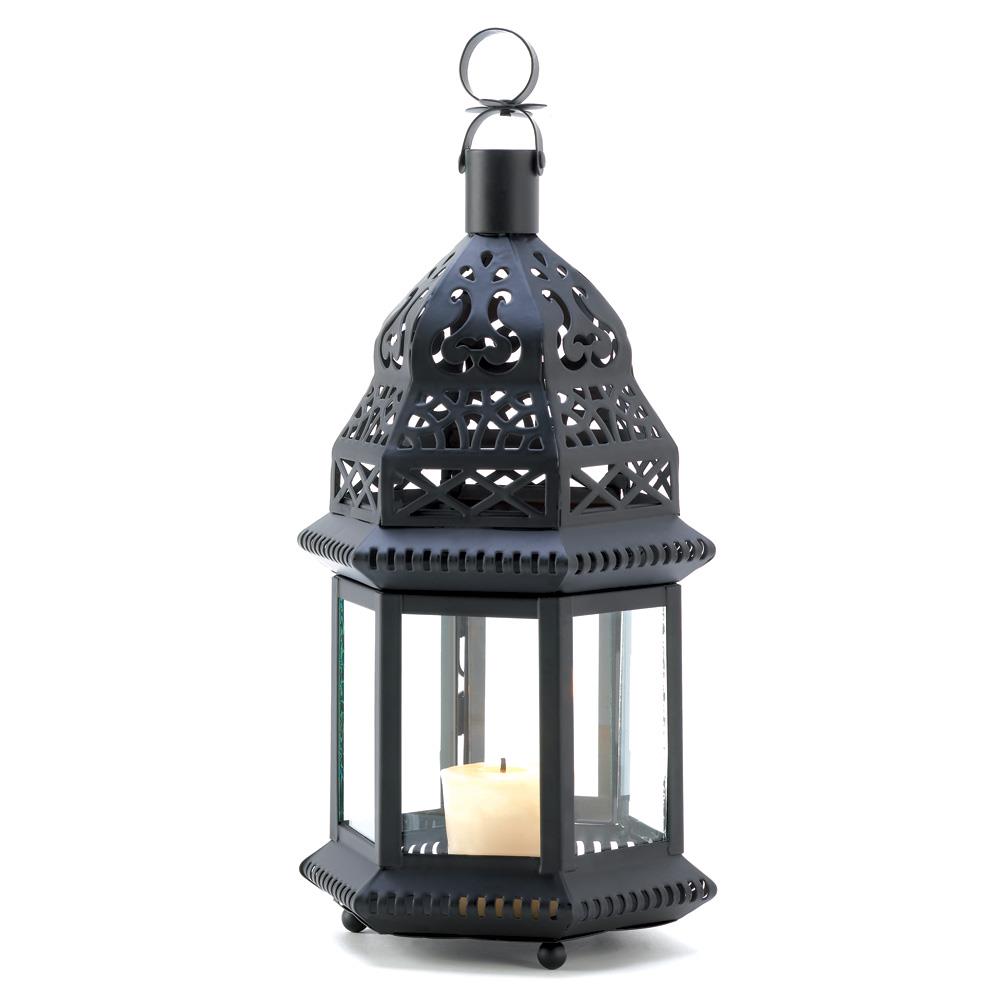 Starlight patterns glow from each cutout of this ornate metalwork candle lantern! Traditional Moroccan styling adds a classic exotic look to any garden setting. Candle not included. Weight 1.2 pounds. 6" x 5" x 12.5". Iron, Glass. UPC Number: 849179012694.