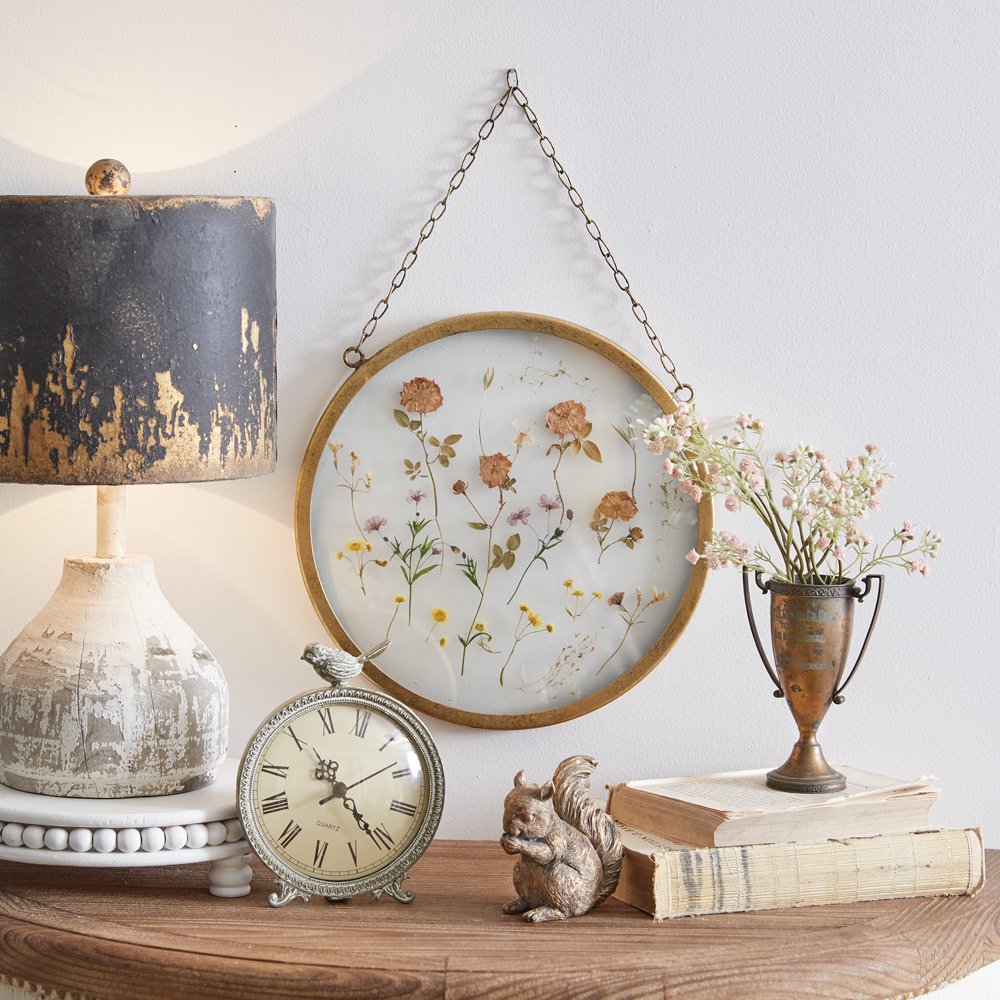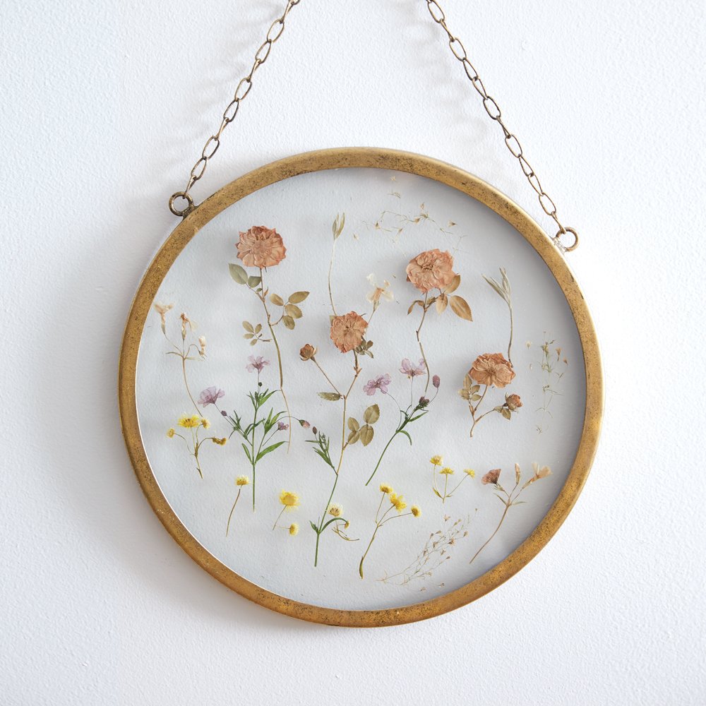 Our Botanical Wall Decor emits grace and elegance with its bunch of real pressed flowers and glistening gold frame. Dried flowers are a product of nature, and as such, each and every item will be unique. To hang, use its chain with a nail.