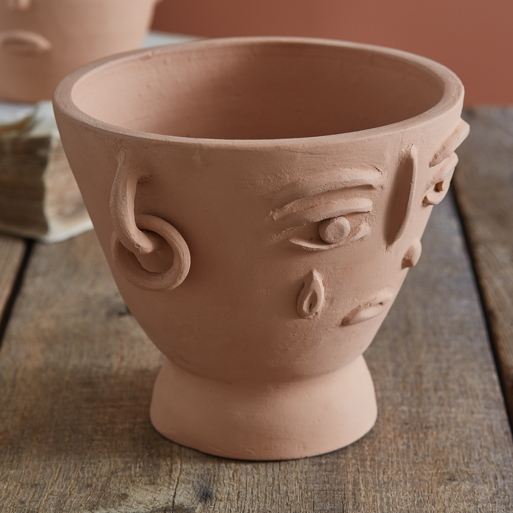 This unique and captivating planter is not just a vessel for your plants, but a masterpiece that adds a touch of innovative elegance to any space. Handcrafted by skilled artisans, its intricate yet abstract facial features evoke a sense of creativity, making it a conversation piece. This terra cotta planter is handmade. Differences in shade and shape are to be expected.