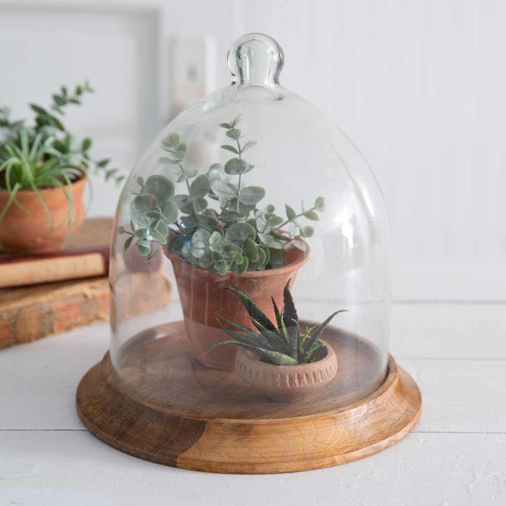 Display your treasured items in this beautiful glass dome showcase. Perfect for antiques, jewelry, or terrariums, this versatile piece can be easily changed out for different events or seasons like weddings and holidays. The wooden base and glass cloche provide a simple, natural look. This item is also food safe, making it a practical and stylish addition to your home decor.