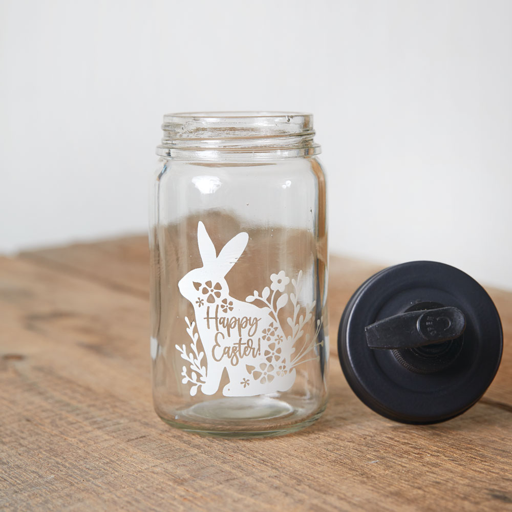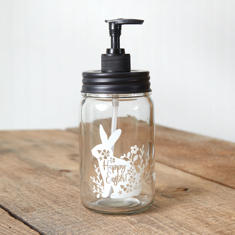 Accessorize your bathroom for the Easter holiday with this darling soap dispenser. It features a bunny with a ''Happy Easter'' message and florals. Holds one pint of liquid. Clear Glass. Features a black pumper.
