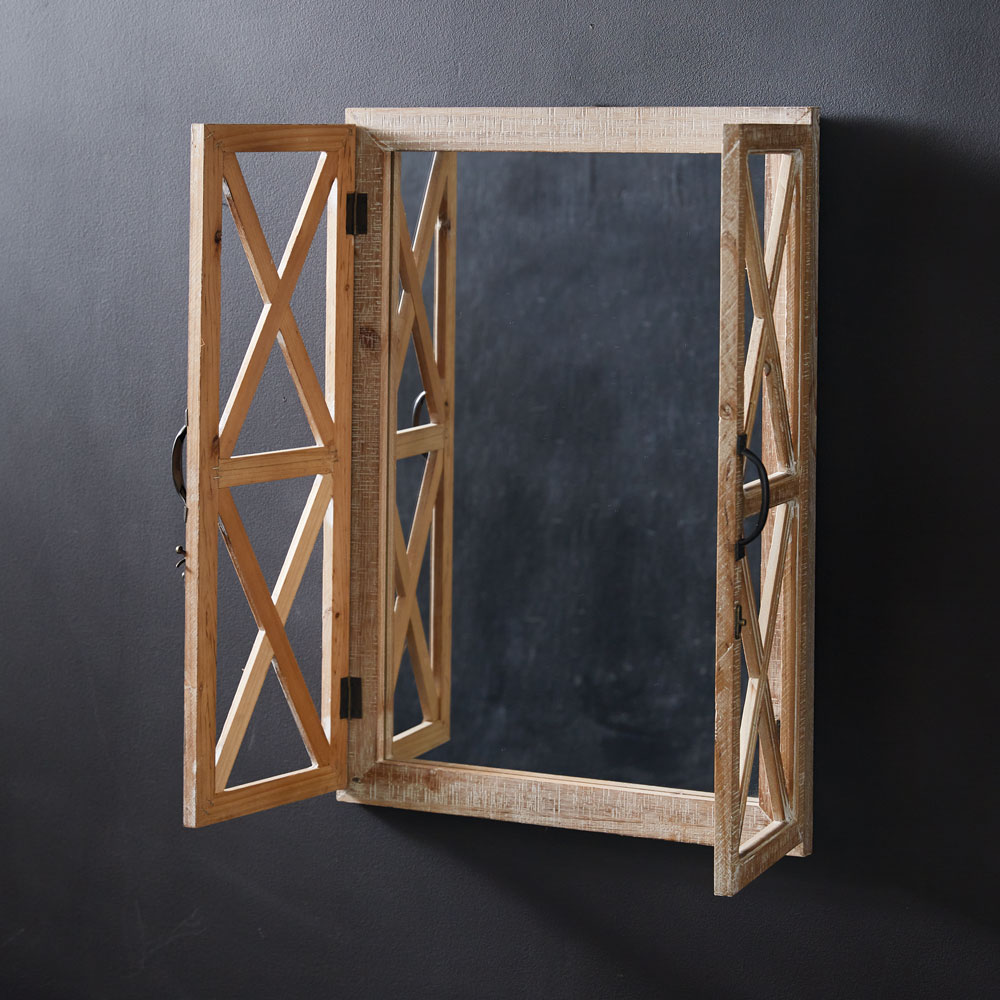 This shutter mirror will have you dreaming of a charming French farmhouse cottage. The unique design will fit perfectly in a bathroom or as an accent mirror. It features a latch to open and close the two shutters and is fashioned of wood. To hang, use its two D-rings.